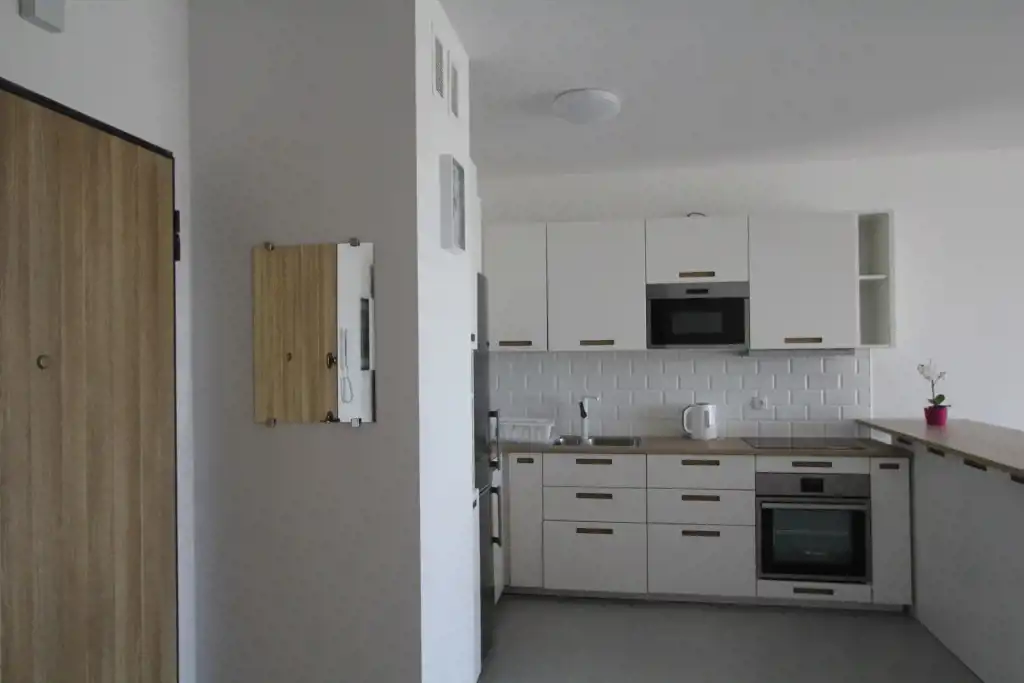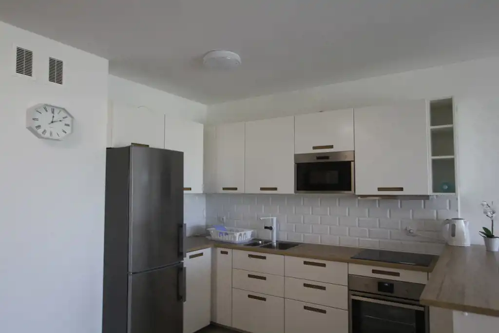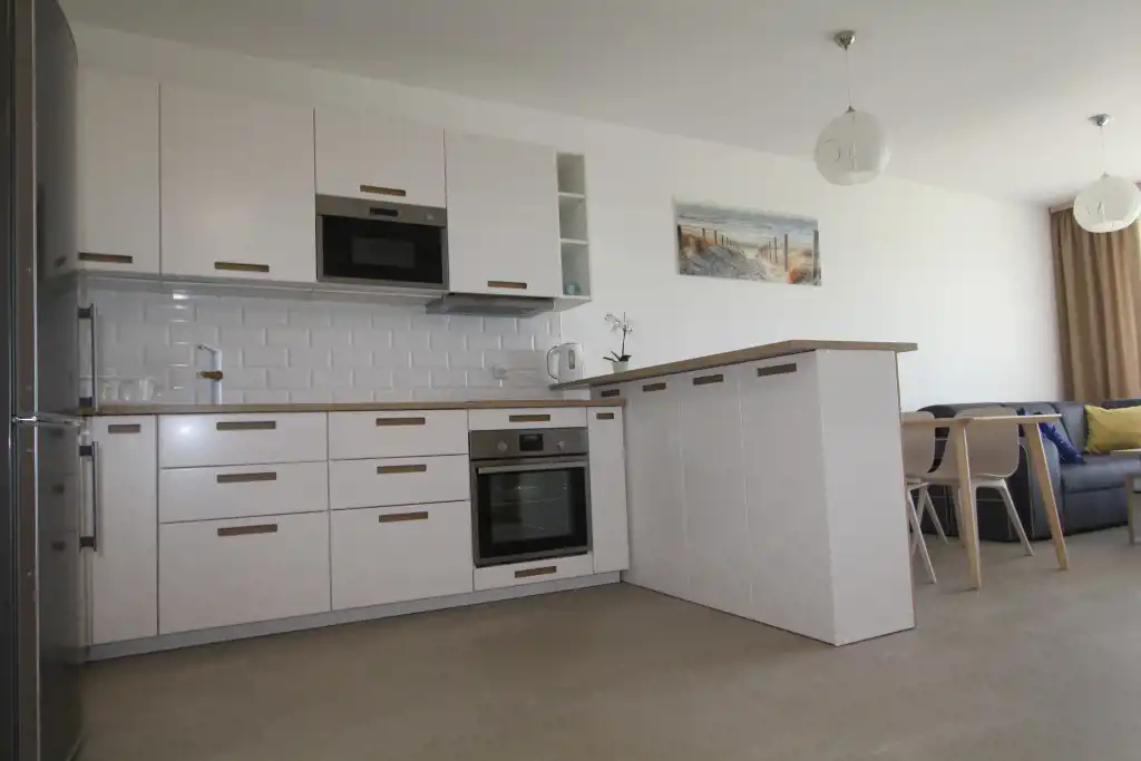 Kuchnia w zabudowie , wyposażona w sprzęt AGD (lodówka, płyta indukcyjna, zmywarka, piekarnik).
