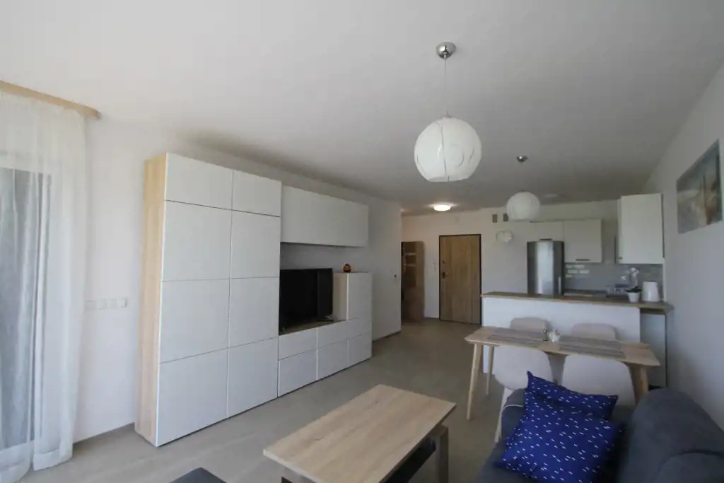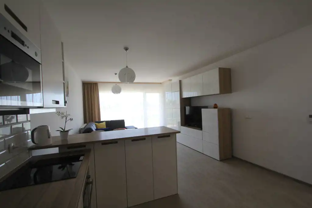 Salon z aneksem kuchennym – otwarta przestrzeń dzienna z wyjściem na taras, duże nowoczesne panoramiczne przeszklenia sprawiają, że mieszkanie jest przestronne i słoneczne.