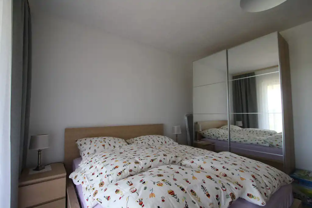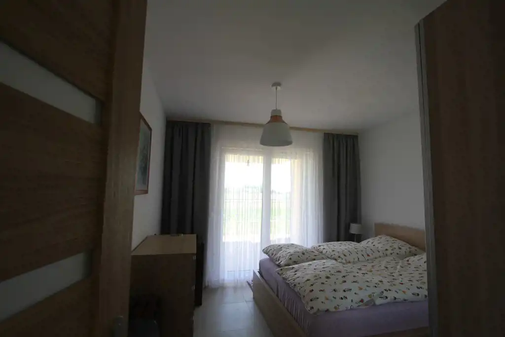 Sypialnia – umeblowana, przytulna, ustawna przestrzeń z wyjściem na taras i ogródek.