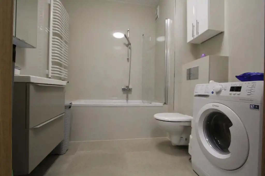 Łazienka – umeblowana, nowocześnie wykończona, z wanną i kabiną prysznicową.