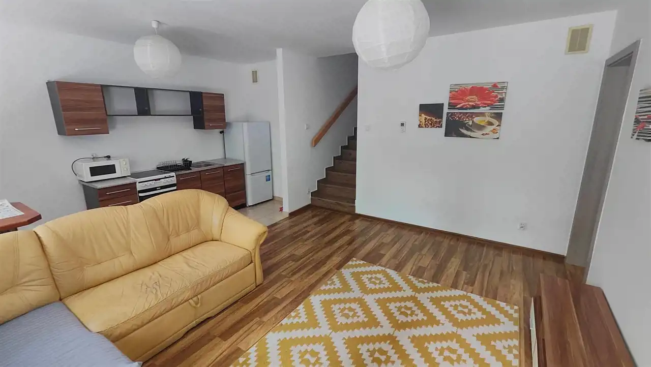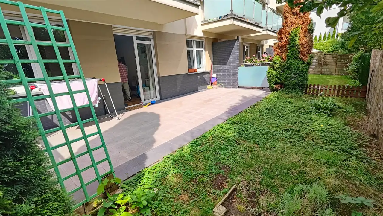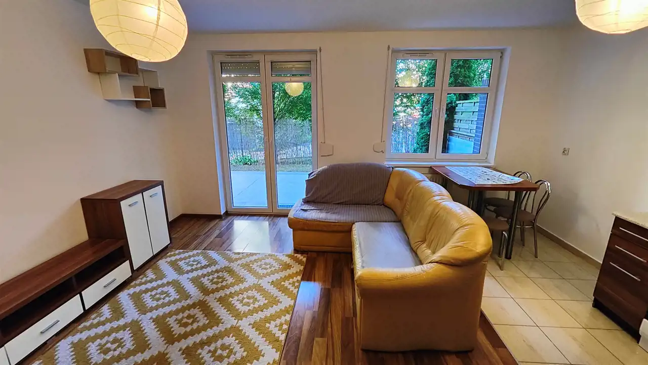- Salon z aneksem kuchennym: Przestronny salon połączony z aneksem kuchennym, z którego wyjście prowadzi na indywidualny ogródek. Idealne miejsce do odpoczynku i spędzania czasu na świeżym powietrzu.