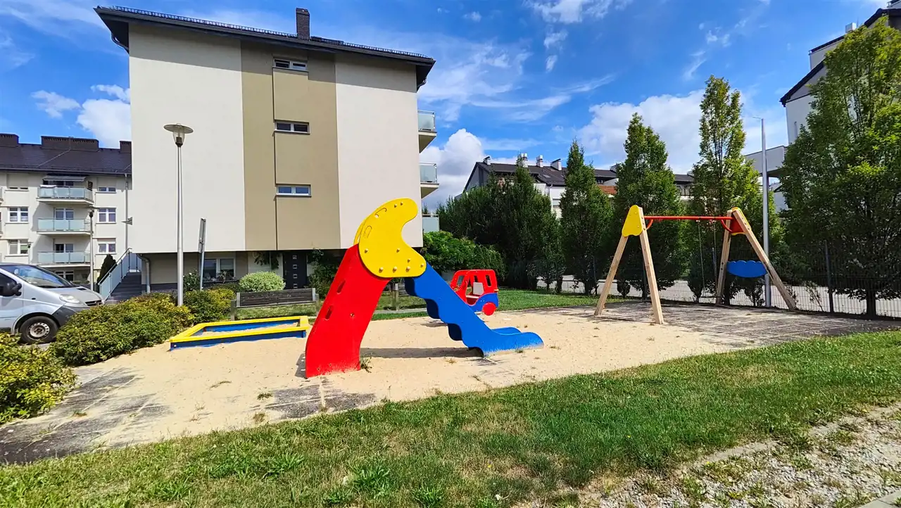 Do dyspozycji najemcy komórka lokatorska w przyziemiu apartamentowca, wózkownia na piętrze, na terenie zamkniętej na szlaban posesji dostępne liczne miejsca postojowe, plac zabaw, miejsca na motocykl/rower w podcieniu budynku.