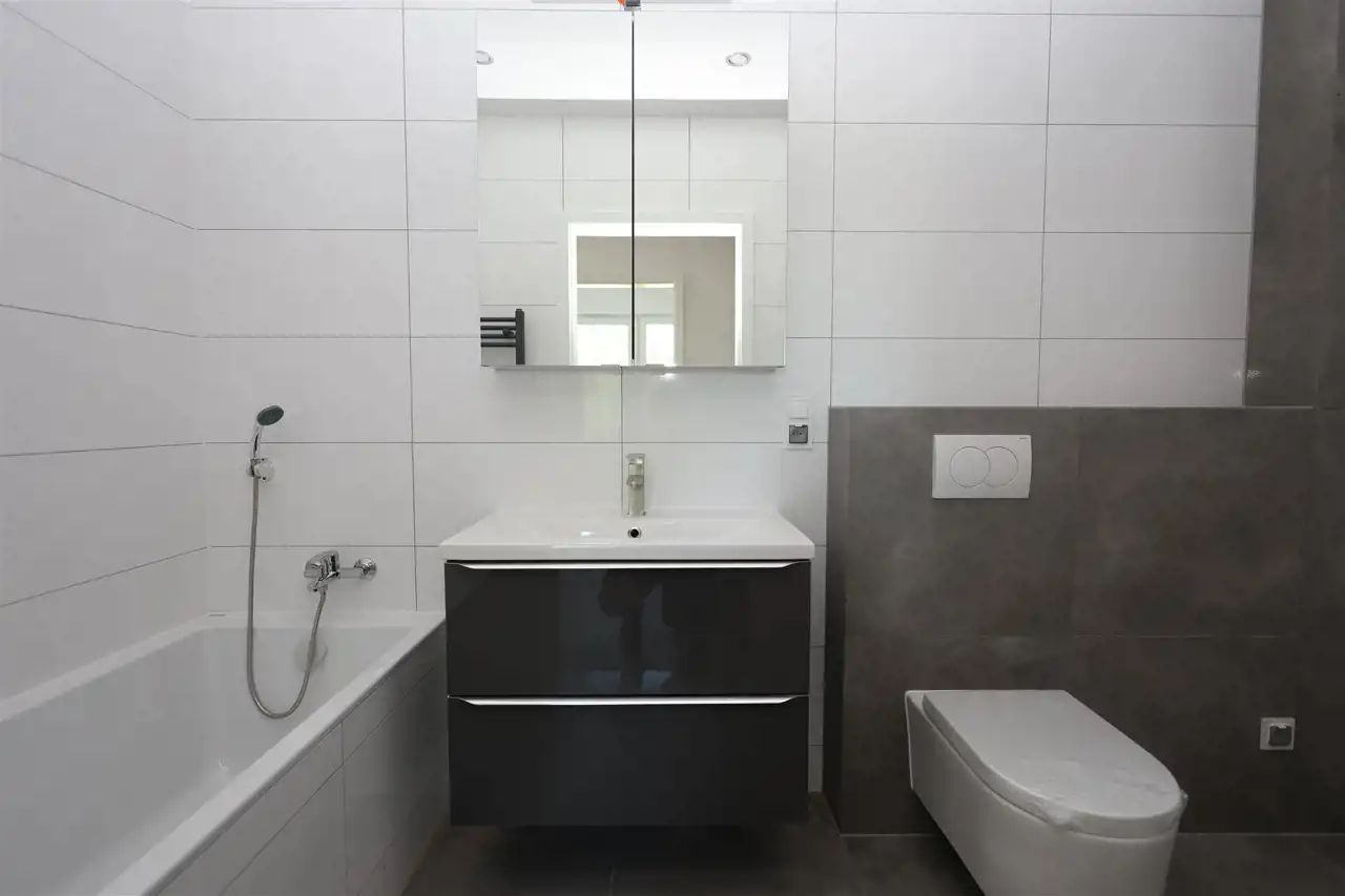 Łazienkę z wanną: Nowocześnie urządzona, zapewniająca komfort użytkowania.