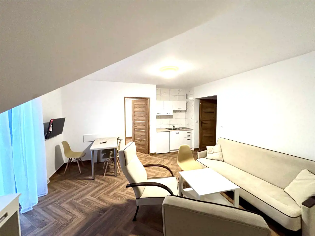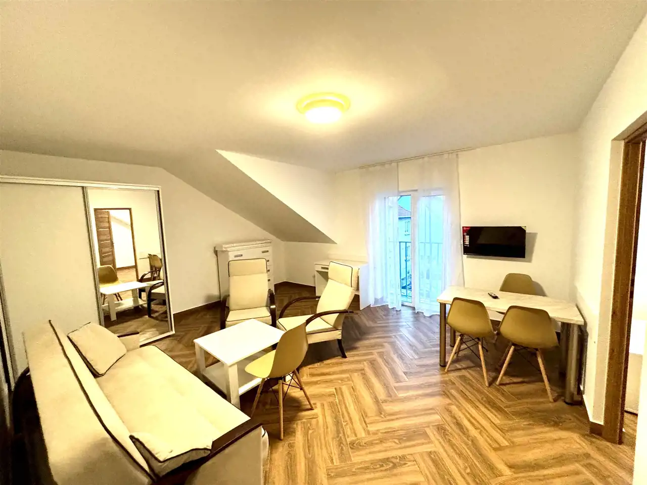 - pełne umeblowanie (łóżko, kanapa, szafy, komoda, stół, stolik)