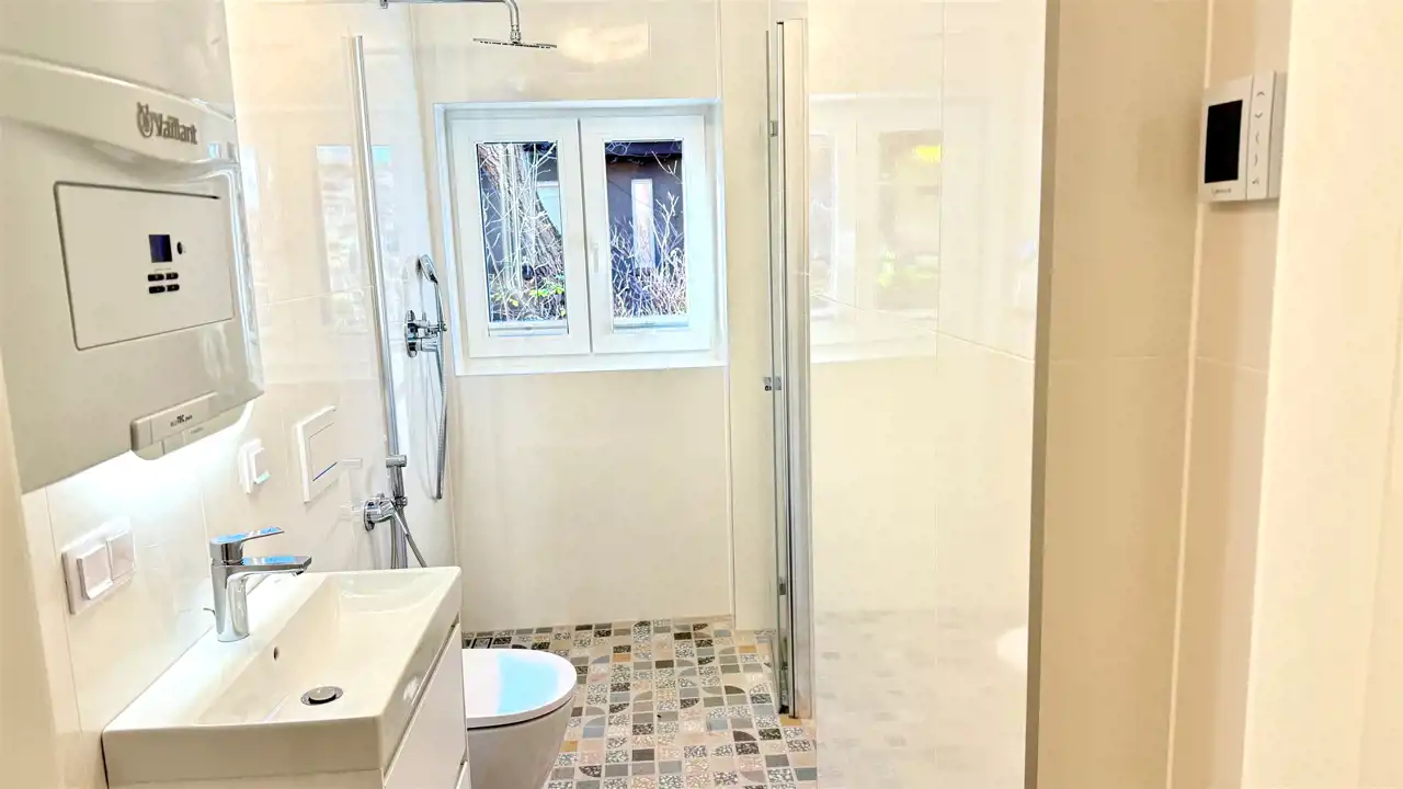 - Nowoczesne wysokiej klasy podłogi - panele w pokojach, nietuzinkowy gres w kuchni, przedpokoju i łazience