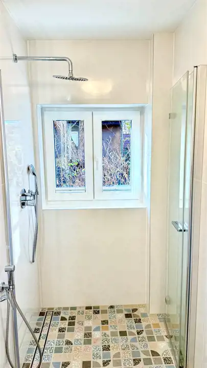 - bezprogowy prysznic ze składanymi szklanymi drzwiami,