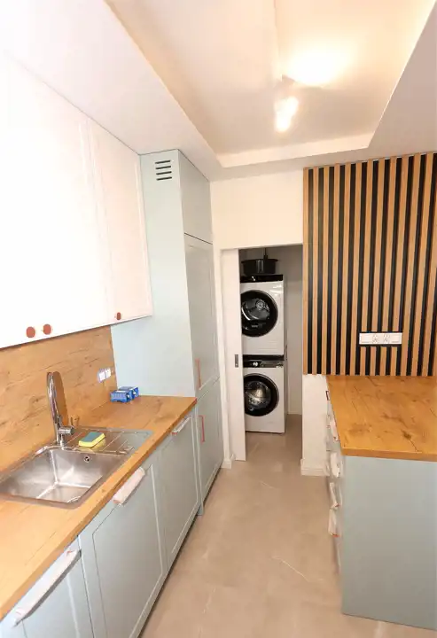 Praktyczne pomieszczenie gospodarcze (schowek/pralnia), które mieści pralkę i suszarkę.
