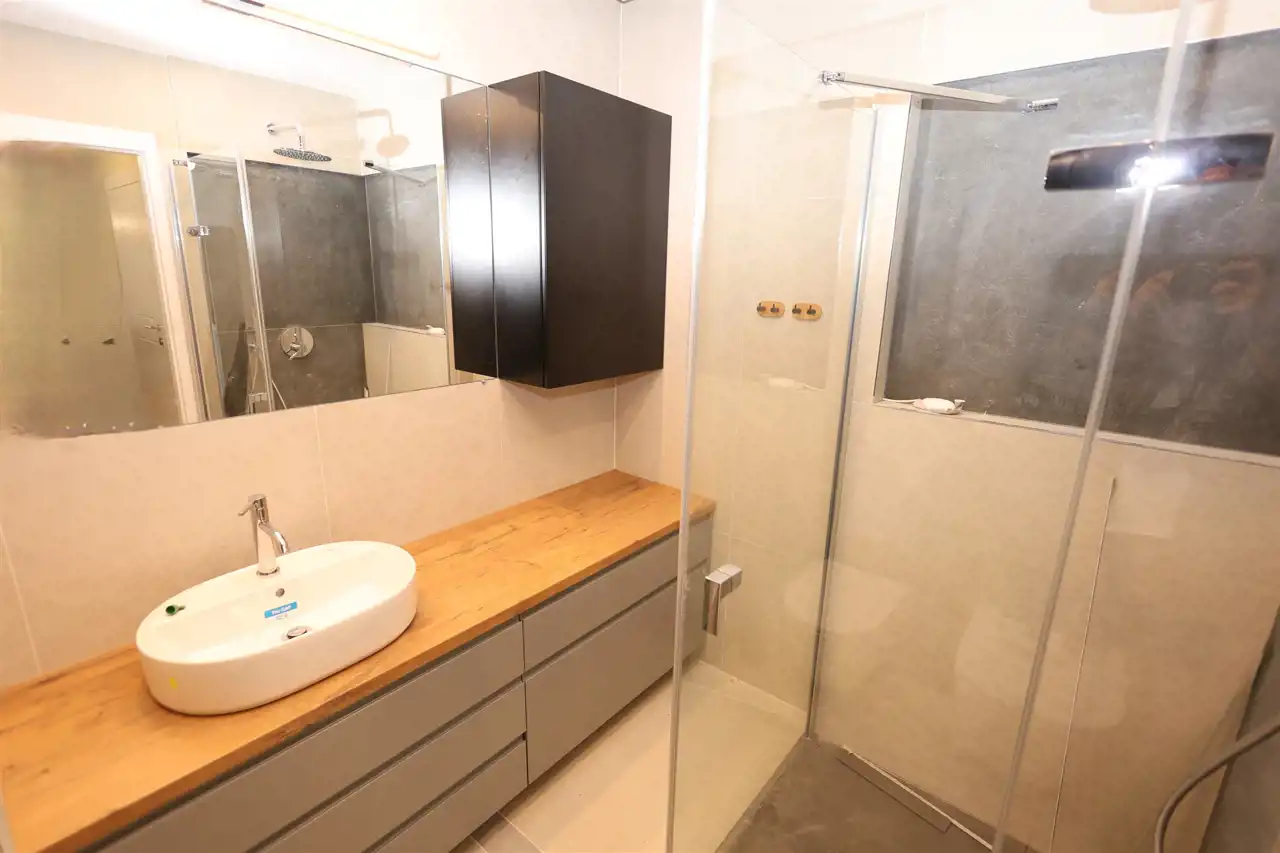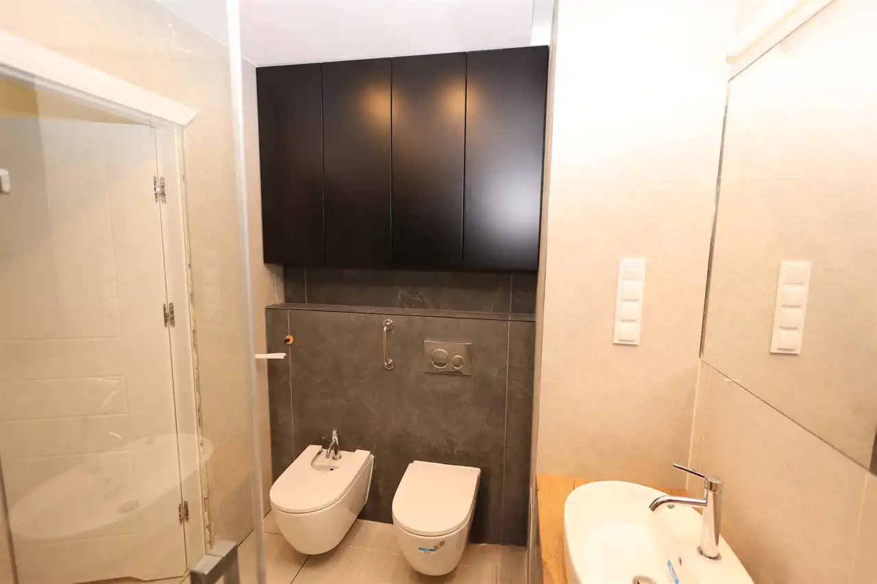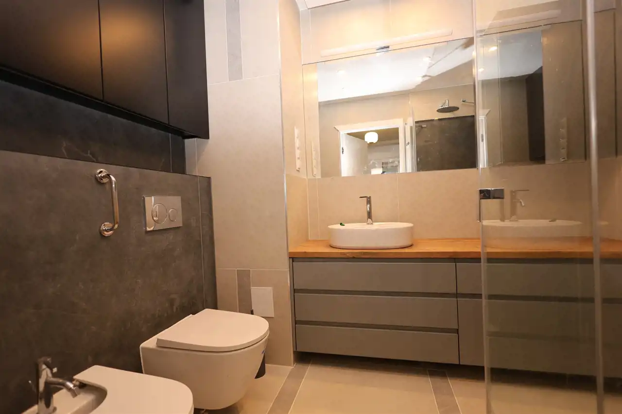 Wyposażona w przestronną kabinę prysznicową typu walk-in oraz bidet.