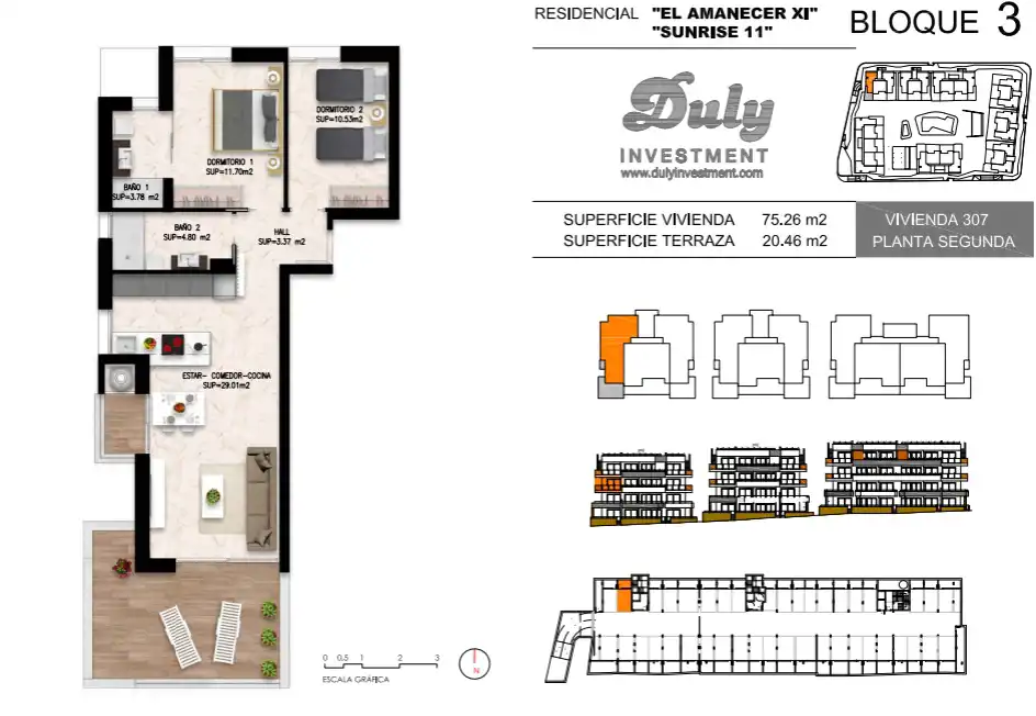 Kompleks mieszkaniowy Amanecer X składa się ze 112 apartamentów z dużymi tarasami. 112 apartamentów z 2 sypialniami i 2 łazienkami. 8 bloków podzielonych na parter, pierwsze piętro, drugie piętro i penthouse'y z prywatnym tarasem do opalania. Każdy z osobną windą