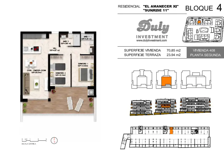 Kompleks mieszkaniowy Amanecer X składa się ze 112 apartamentów z dużymi tarasami. 112 apartamentów z 2 sypialniami i 2 łazienkami. 8 bloków podzielonych na parter, pierwsze piętro, drugie piętro i penthouse'y z prywatnym tarasem do opalania. Każdy z osobną windą