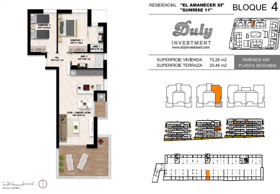 Kompleks mieszkaniowy Amanecer X składa się ze 112 apartamentów z dużymi tarasami. 112 apartamentów z 2 sypialniami i 2 łazienkami. 8 bloków podzielonych na parter, pierwsze piętro, drugie piętro i penthouse'y z prywatnym tarasem do opalania. Każdy z osobną windą