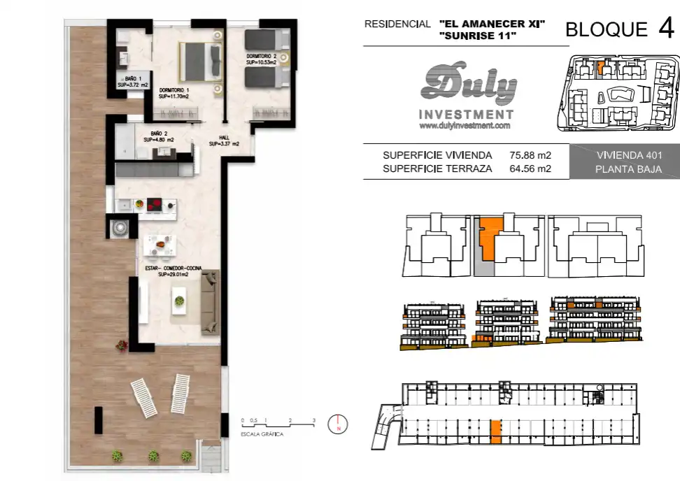 Kompleks mieszkaniowy Amanecer X składa się ze 112 apartamentów z dużymi tarasami. 112 apartamentów z 2 sypialniami i 2 łazienkami. 8 bloków podzielonych na parter, pierwsze piętro, drugie piętro i penthouse'y z prywatnym tarasem do opalania. Każdy z osobną windą