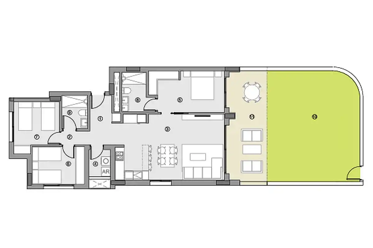 - Duży taras (15 m²) oraz solarium (44 m²)