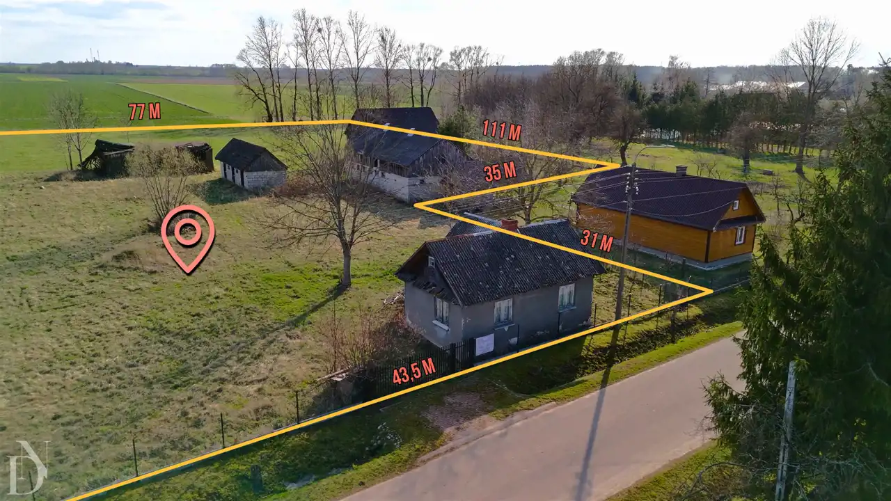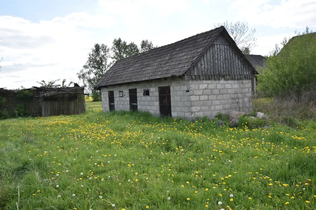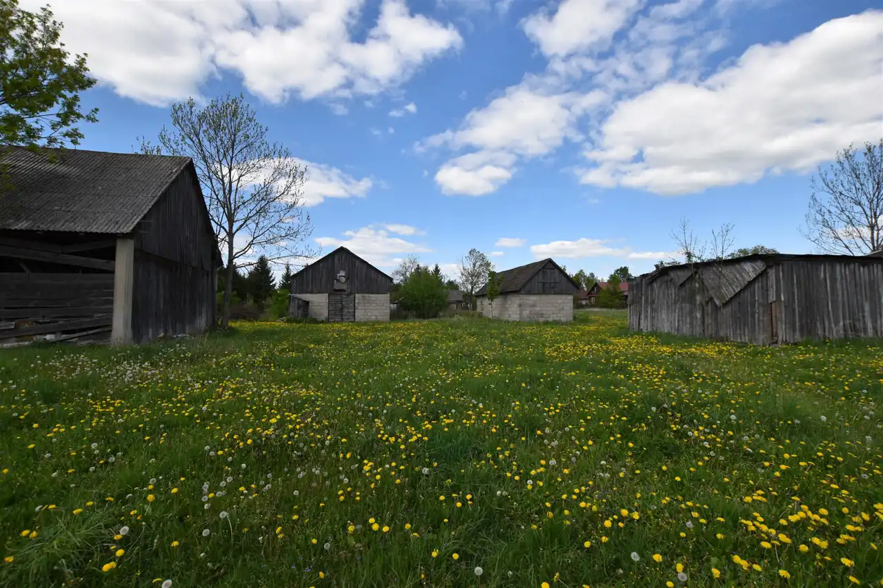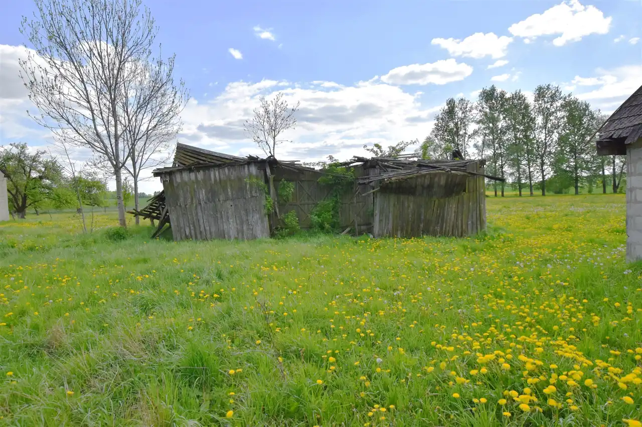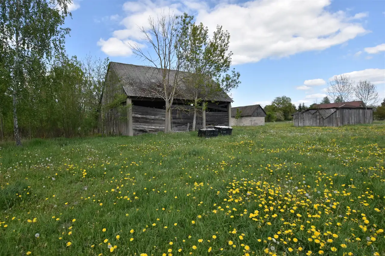 Na działce znajduje się dom z cegły o powierzchni około 65 m², który składa się z czterech izb: przedsionka, kuchnia która jest centralnym punktem z piecem chlebowym oraz dwóch pokoi. Całość ogrzewana jest dwoma piecami kaflowymi, co nadaje wnętrzu niepowtarzalny klimat. Dodatkowo, na terenie posesji znajdują się dwie stodoły – jedna z nich z pustaków betonowych, druga na słupach żelbetowych ściany z bala, każda o powierzchni 100 m². Chlew z bloczków betonowych o powierzchni 50 m² oraz stodoła z bala, która wymaga pilnej interwencji.