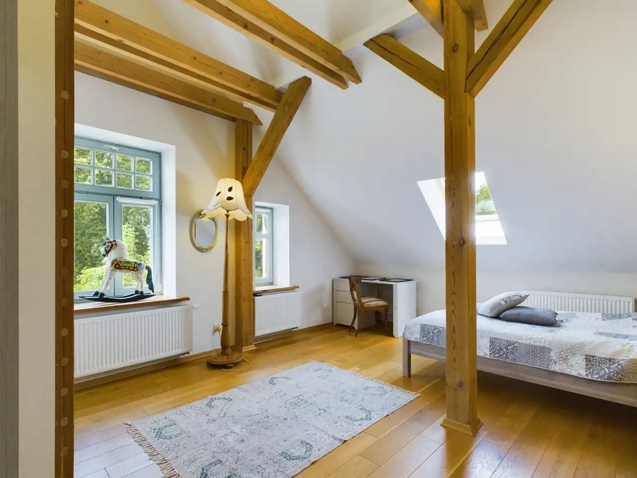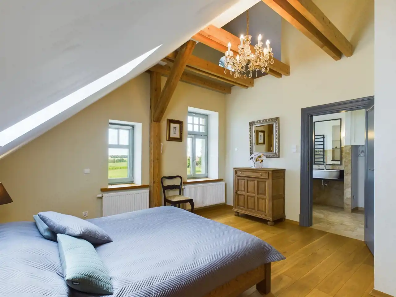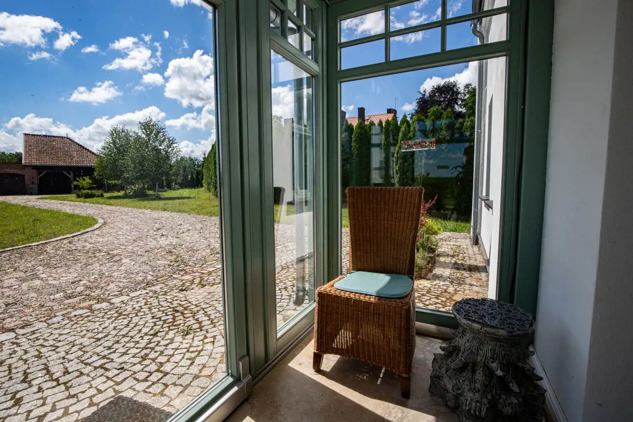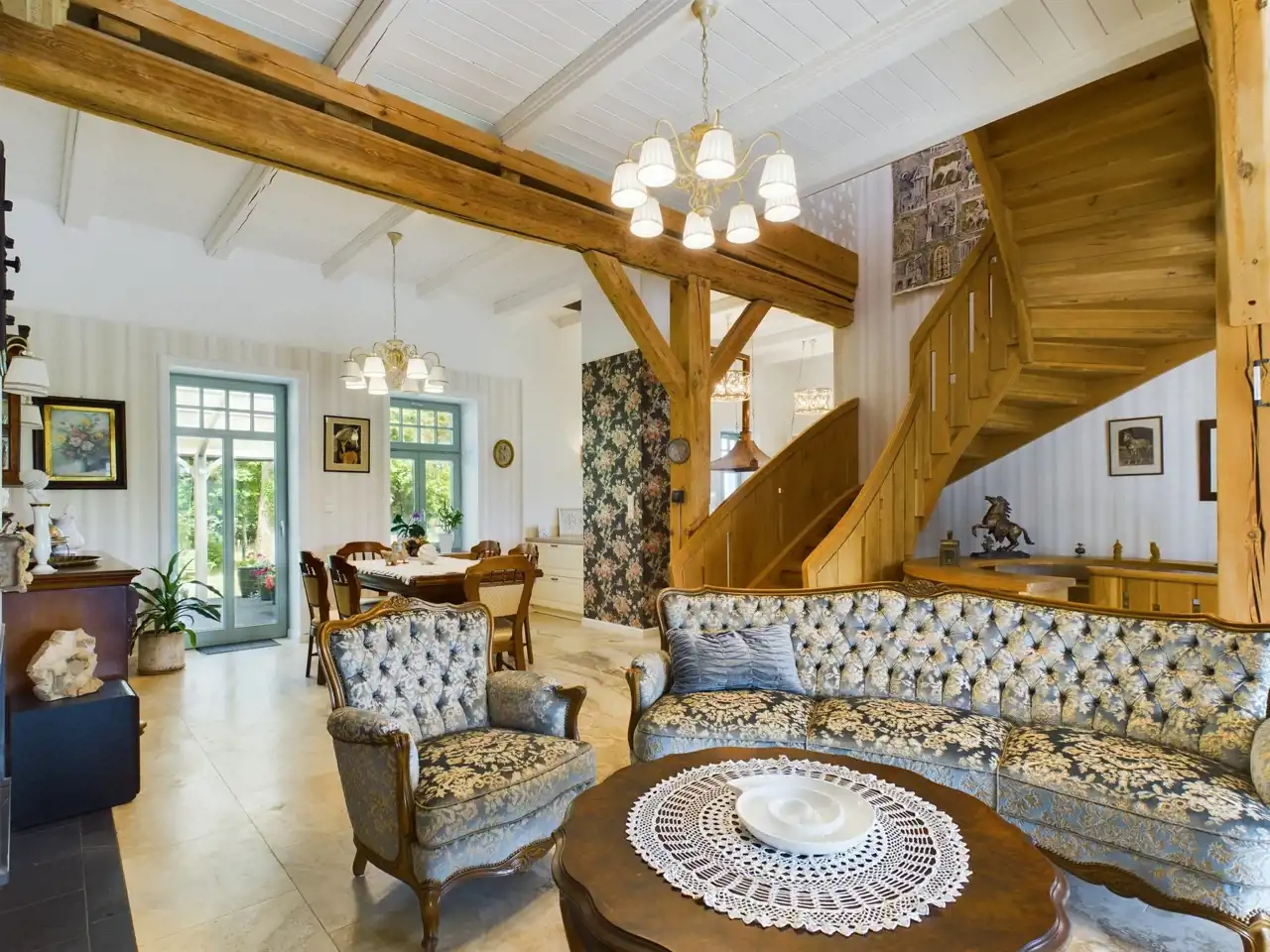 Okna są dębowe, 3 szybowe, schody także dębowe, które są piękne i zajmują centralną część budynku. Na podłogach w pokojach i salonach jest parkiet dębowy, w łazienkach na podłodze oryginalny kamień naturalny Trawertyn, pod sufitem 200 letnie zachowane oryginalne belki nośne. Na dachu dachówka ceramiczna z rynnami metalowo-cynkowymi.