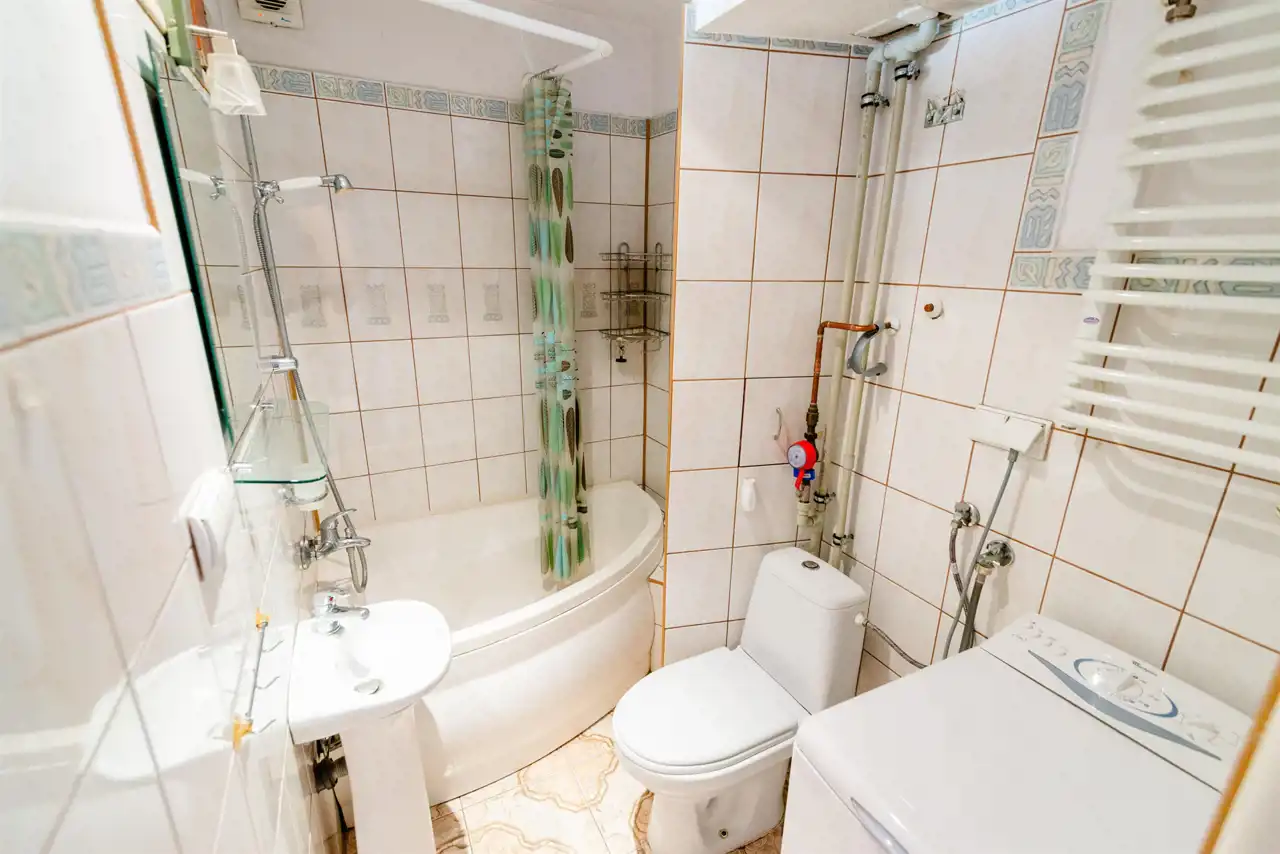 - Łazienka: Kabina prysznicowa, pralka, umywalka, wc