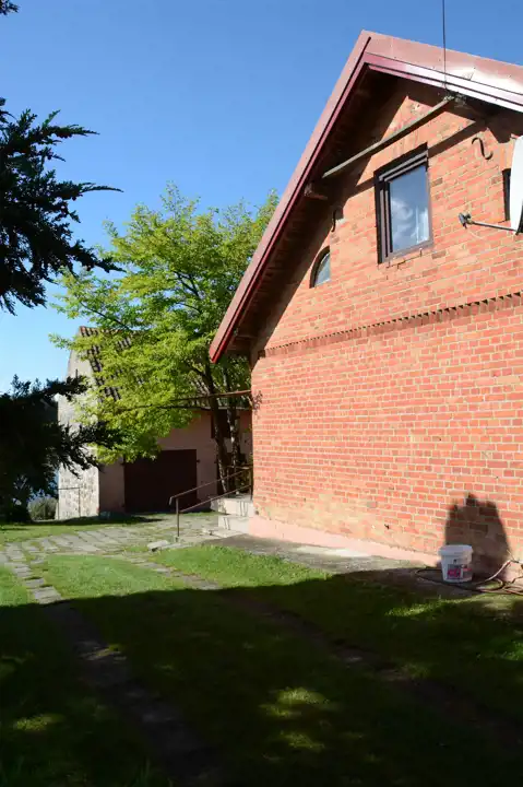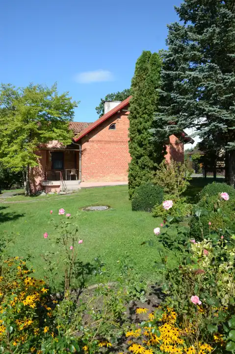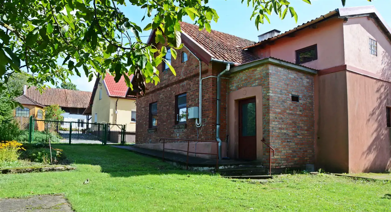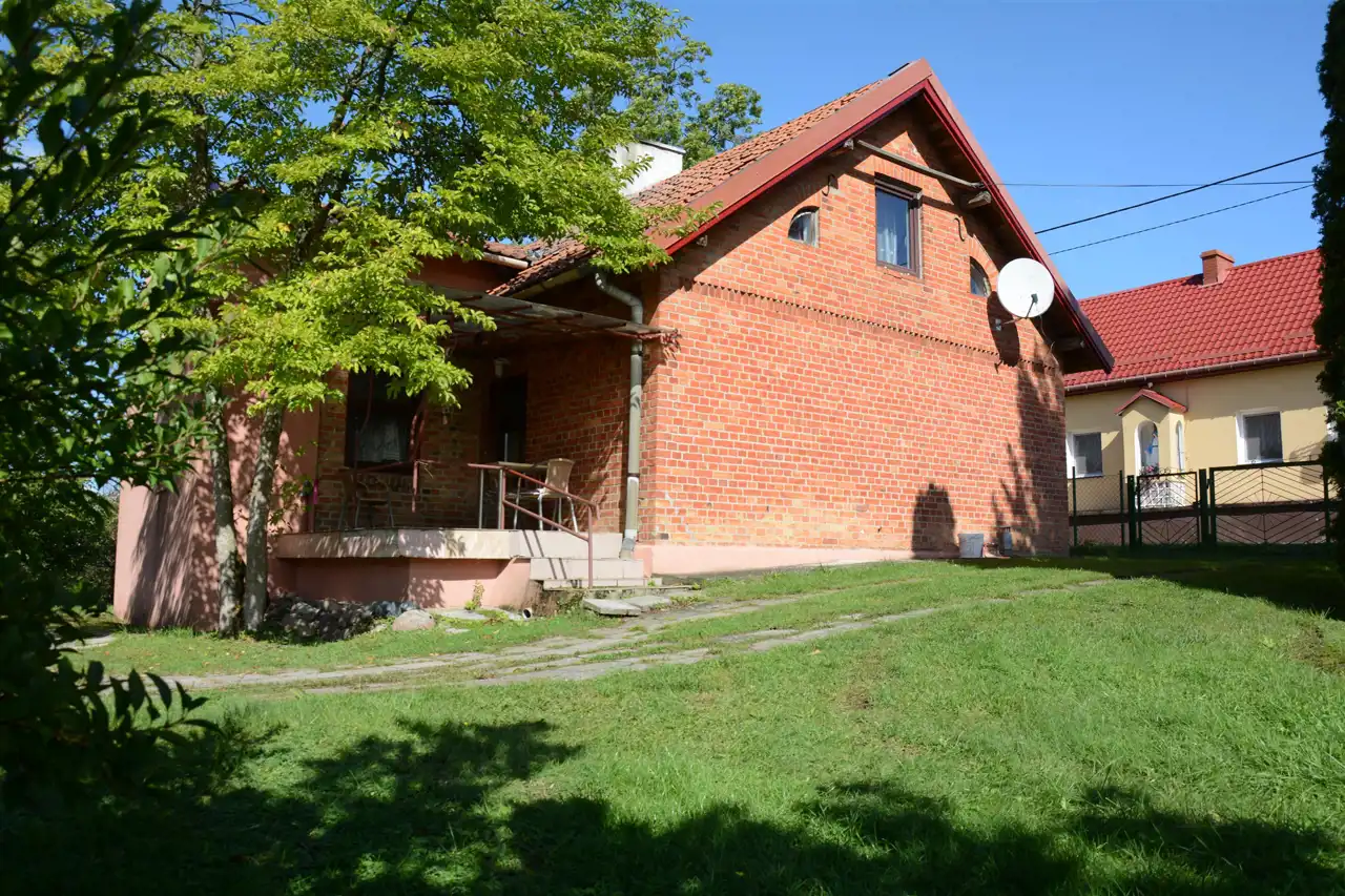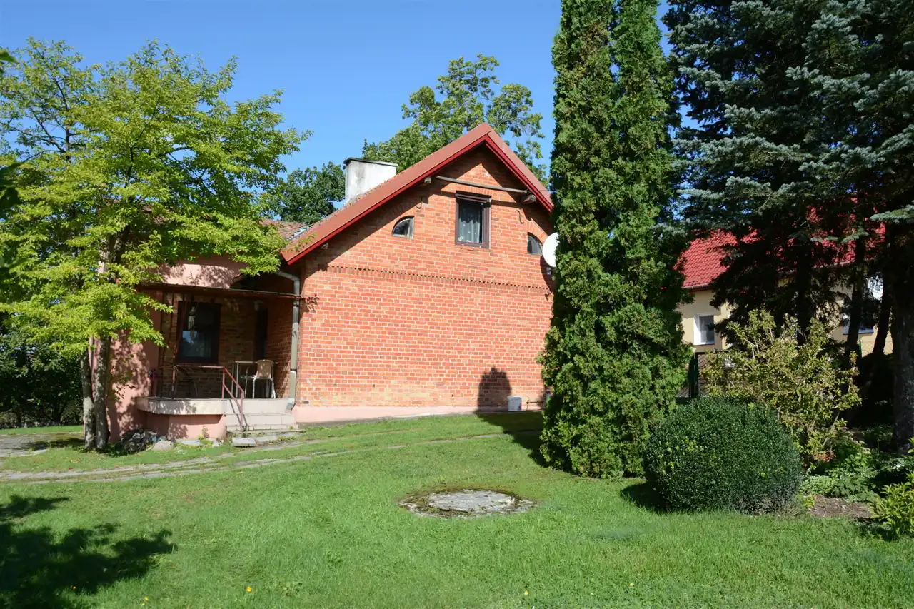 Główny budynek mieszkalny z czerwonej cegły – solidny, w bardzo dobrym stanie technicznym, w pełni podpiwniczony.