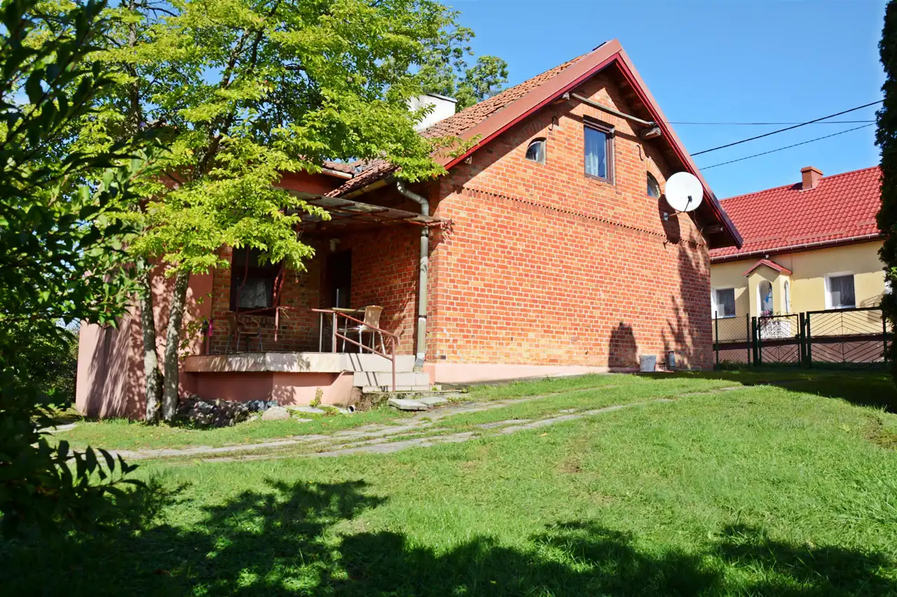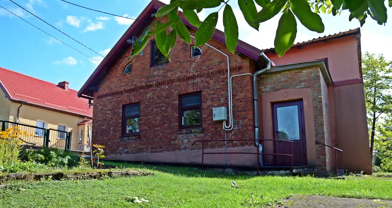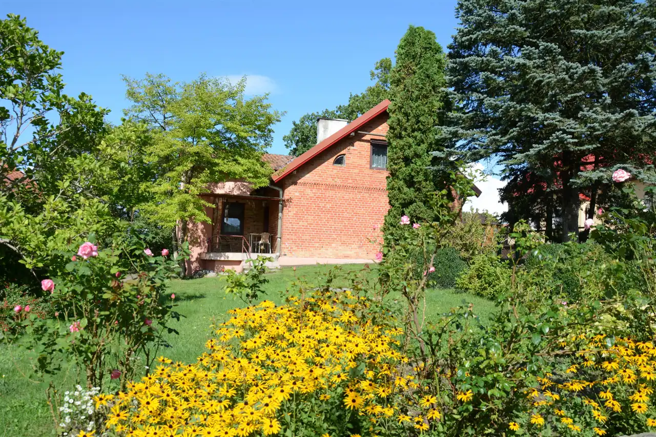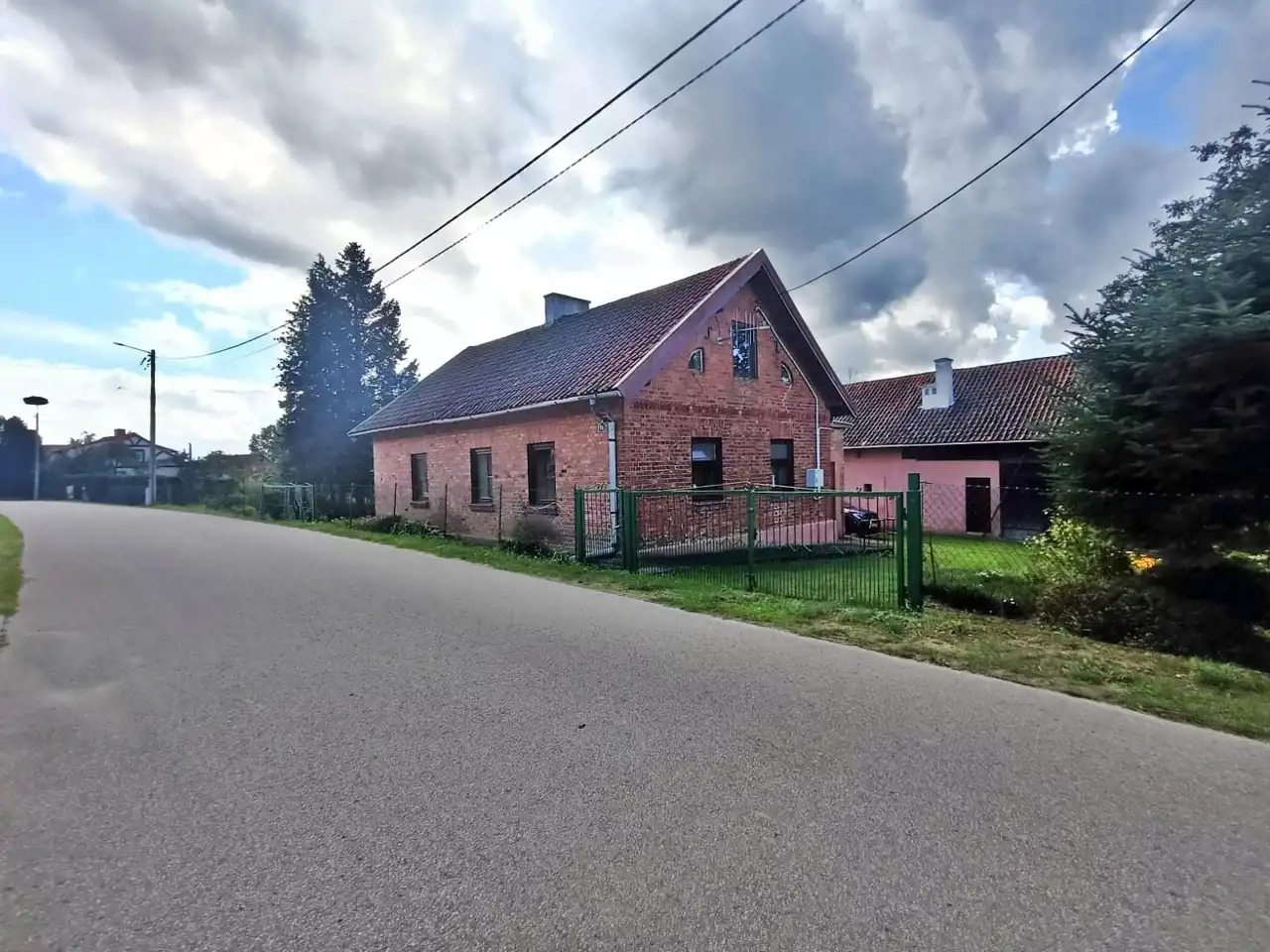 Główny budynek mieszkalny z czerwonej cegły – solidny, w bardzo dobrym stanie technicznym, w pełni podpiwniczony.