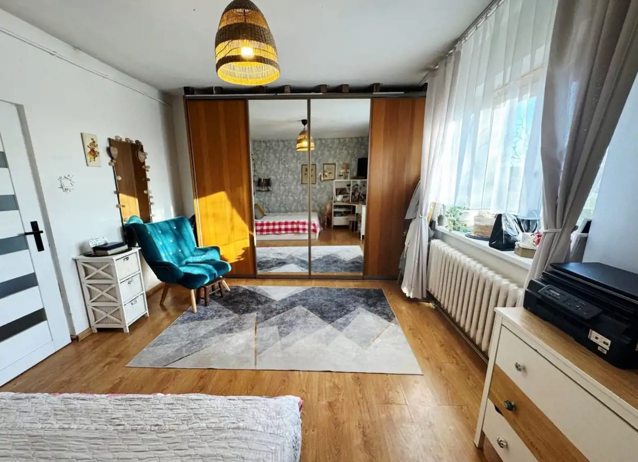 Dom składa się z trzech przytulnych pokoi oraz przestronnej kuchni z jadalnią. Kuchnia jest w pełni zabudowana, a część mebli pozostaje w cenie; pozostałe elementy wyposażenia można ustalić indywidualnie. W pokojach na podłogach położono panele, natomiast w kuchni – płytki. W budynku znajduje się drewniany strop oraz duży strych z wejściem z korytarza, który może służyć jako przestrzeń magazynowa lub zostać zaadaptowany według potrzeb. Dom ogrzewany jest piecem na węgiel, a ciepło rozprowadzane jest przez grzejniki znajdujące się w pokojach. Przed wejściem znajduje się wygodny taras, idealny do wypoczynku.