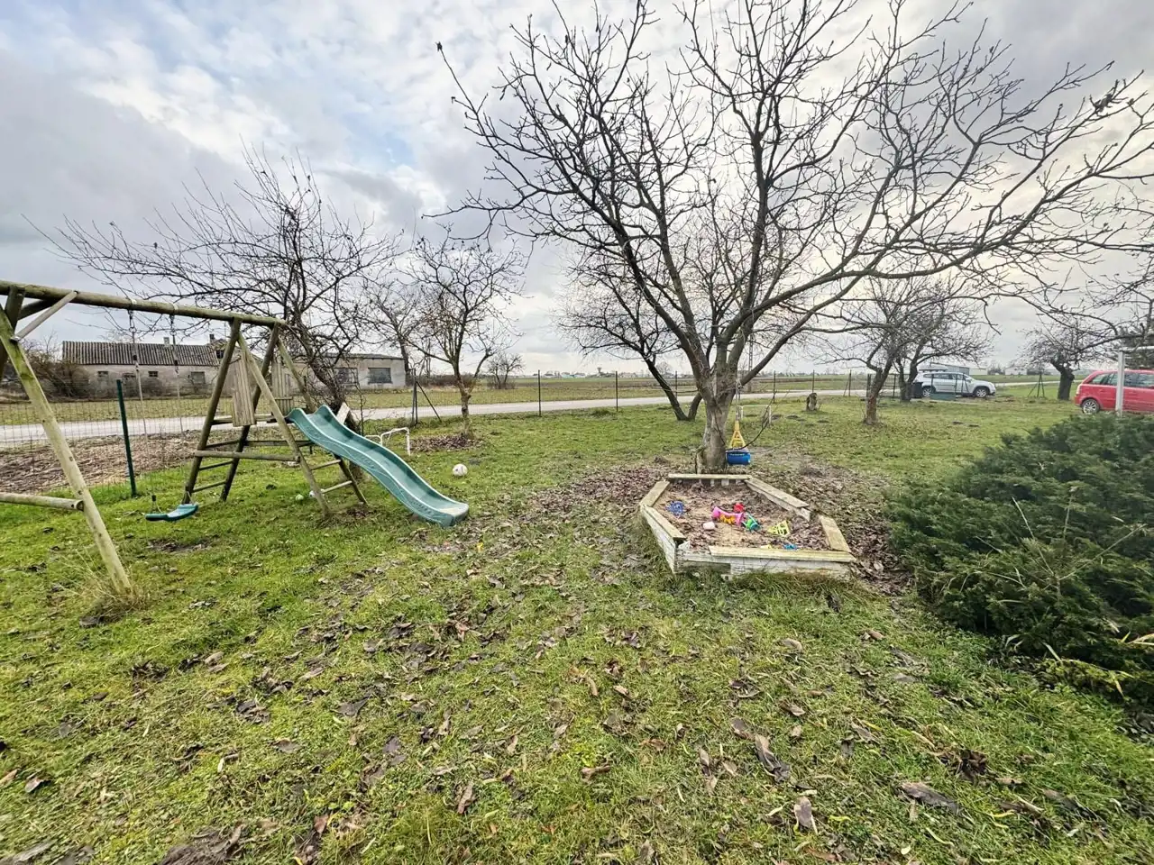 Nieruchomość zachwyca dużą, zieloną przestrzenią. W ogrodzie rośnie wiele drzew owocowych, w tym około dziesięciu jabłoni, a także śliwy, wiśnie, brzoskwinie, czereśnia i pigwa. Dodatkowo znajdują się tu maliny, czarna porzeczka, jagody i winogrono. Jest także dużo miejsca do prowadzenia własnych upraw warzywnych. Dla najmłodszych przygotowano plac zabaw, który stanowi świetną przestrzeń do zabawy na świeżym powietrzu.