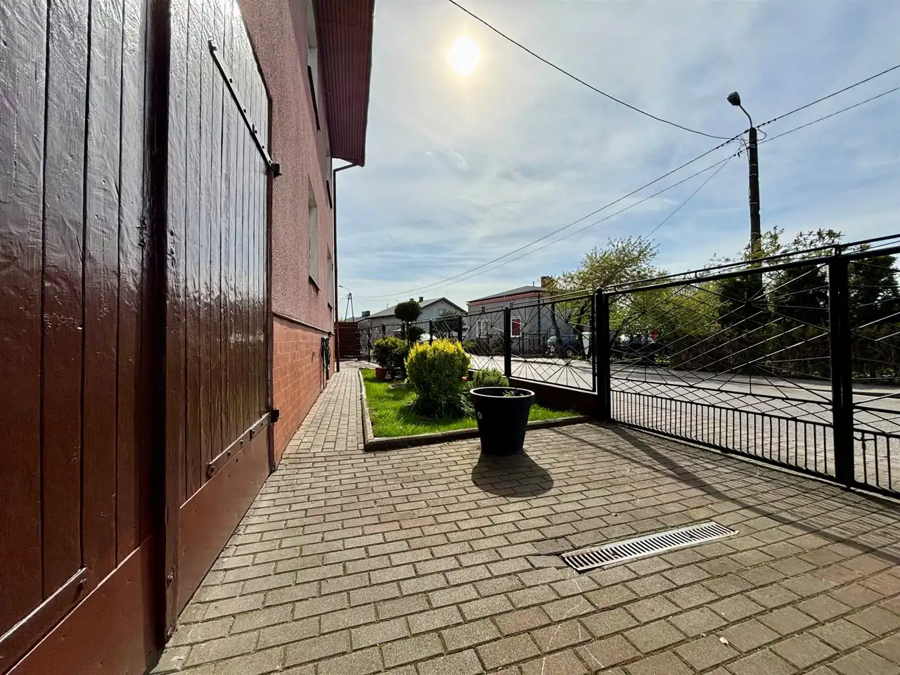 Położony jest na działce o powierzchni 599 m2 w kształcie zbliżonym do kwadratu, na której znajdziemy podjazd z kostki brukowej oraz drobny ogródek.