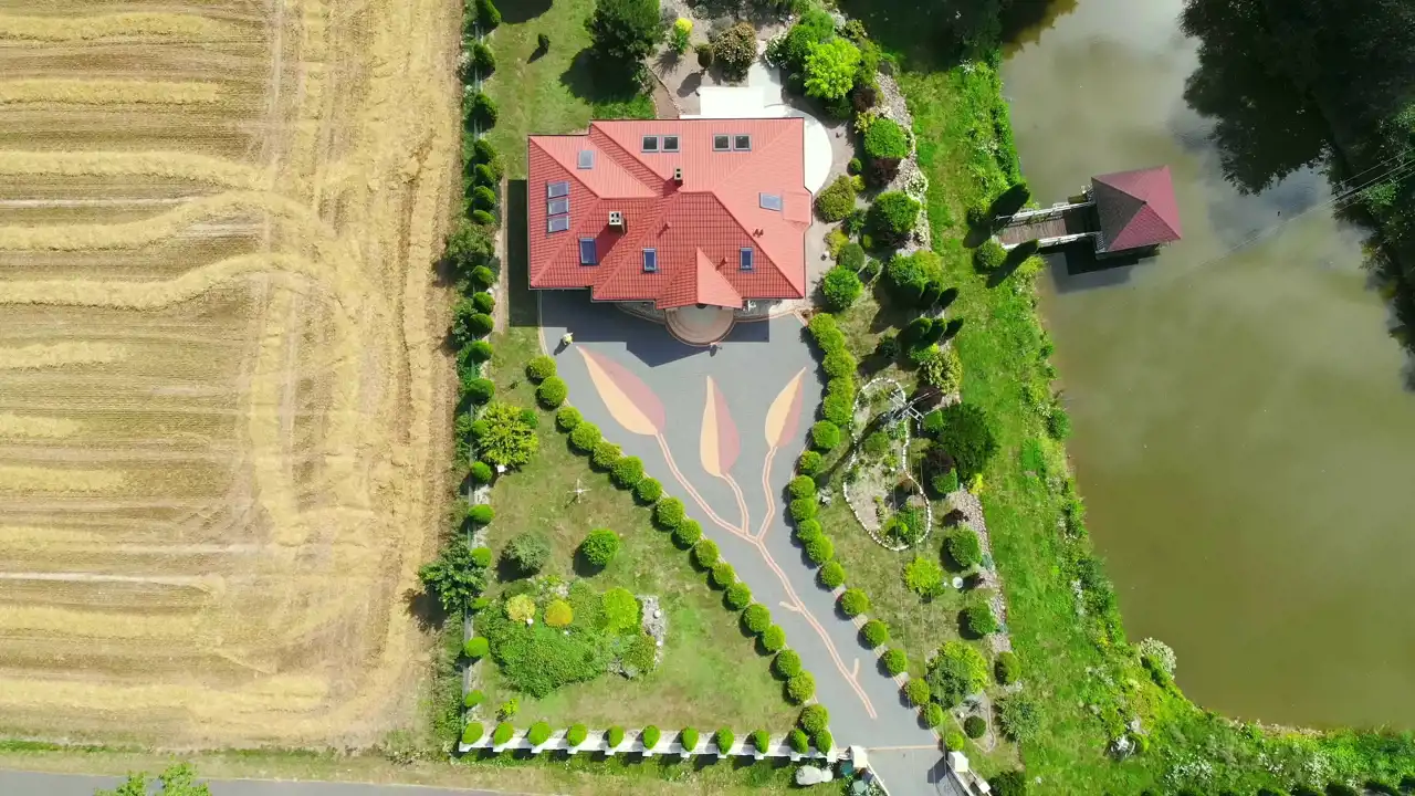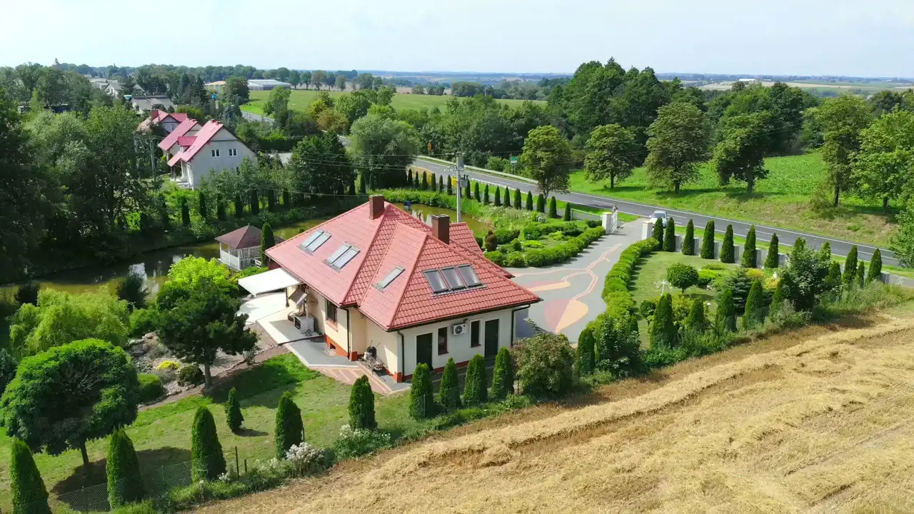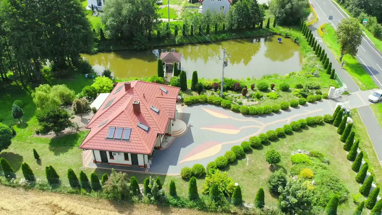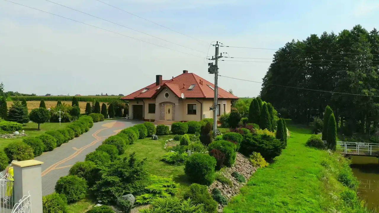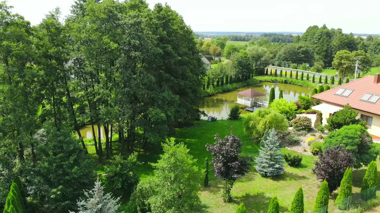 Dom otoczony jest zielenią . Z salonu wyjście na taras , do ogrodu i nad staw.
