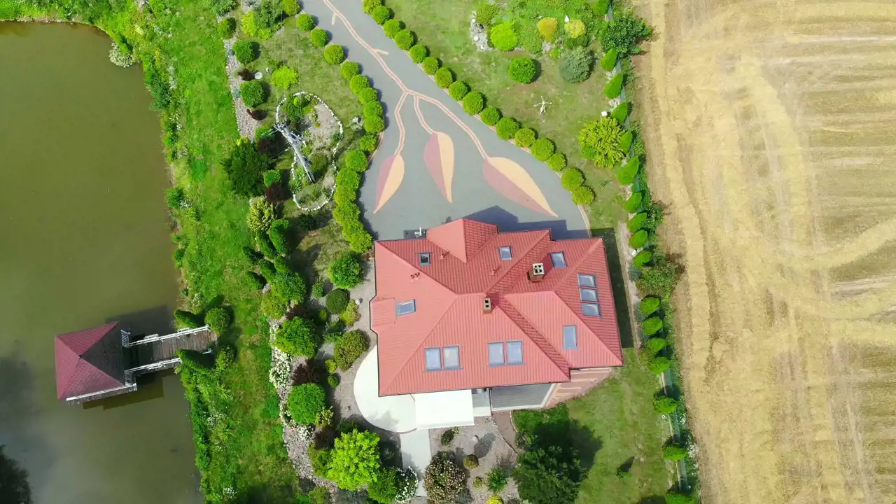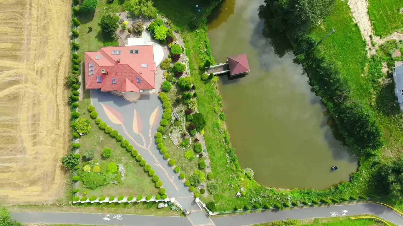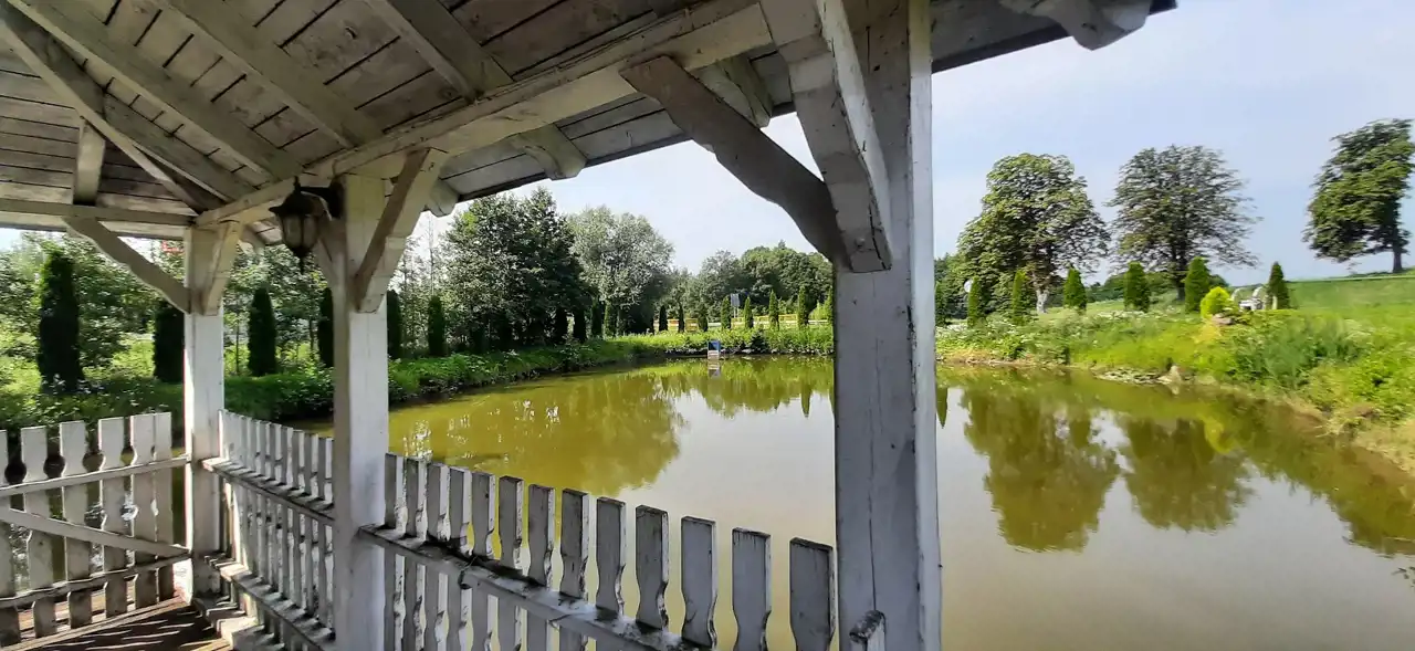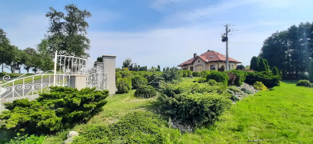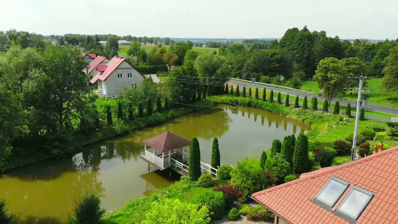 Dom otoczony jest zielenią . Z salonu wyjście na taras , do ogrodu i nad staw.