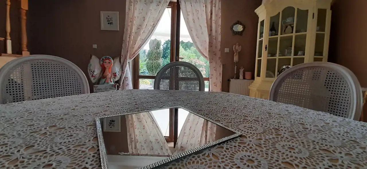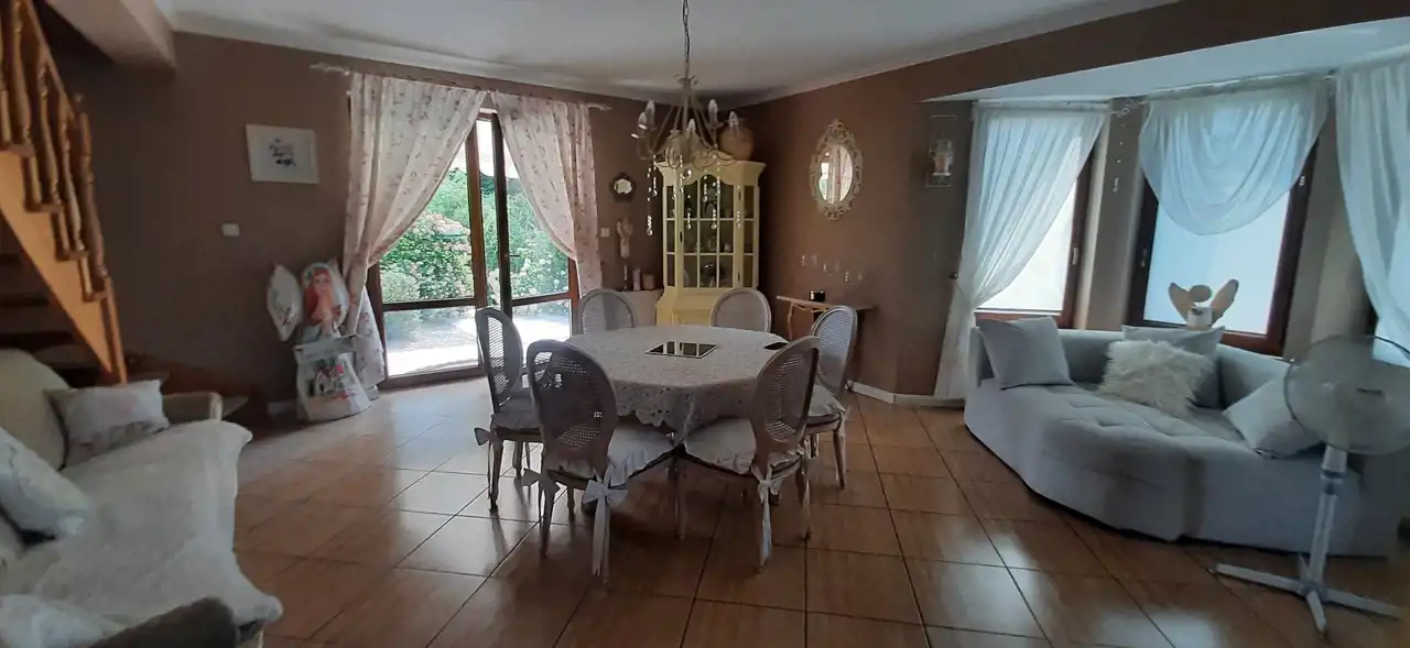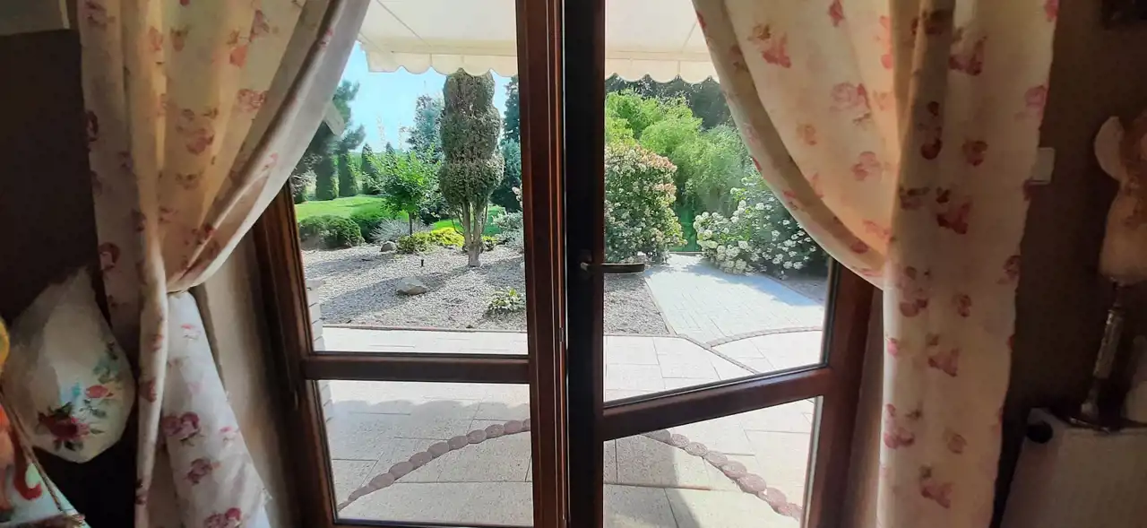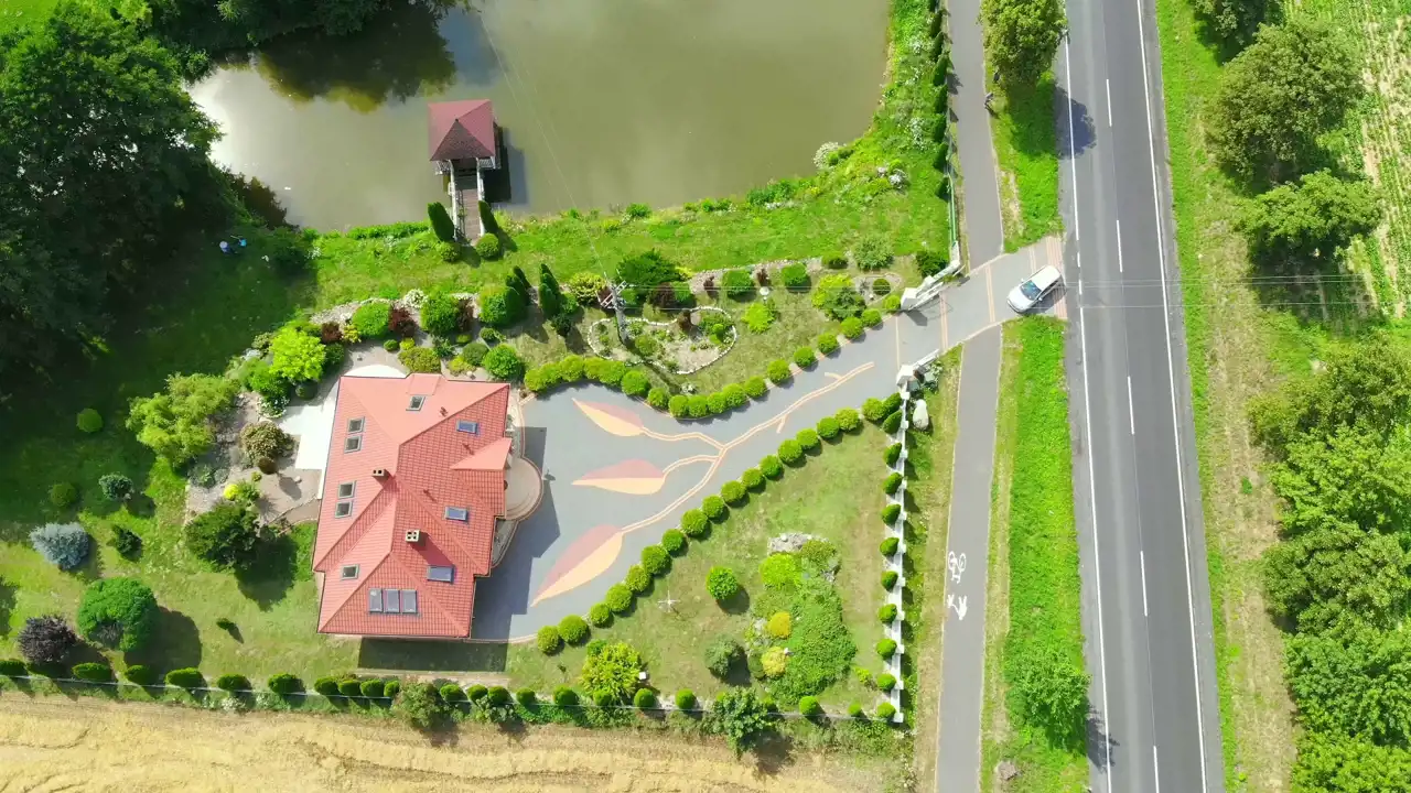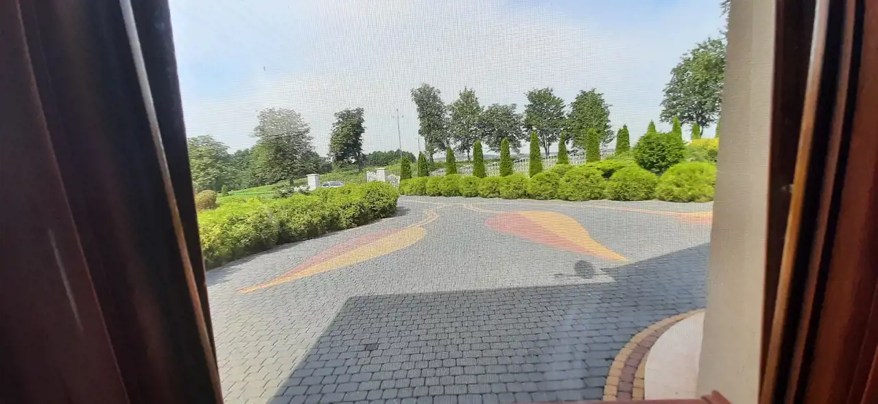 Dom otoczony jest zielenią . Z salonu wyjście na taras , do ogrodu i nad staw.