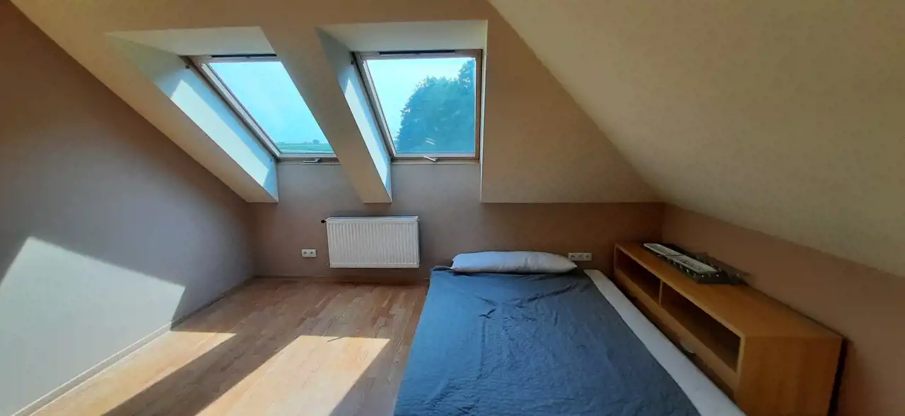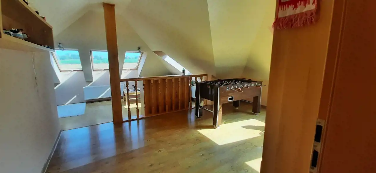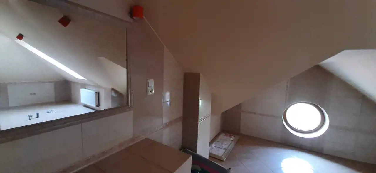 Na piętrze duży pokój dzienny (istnieje możliwość podziału na mniejsze pomieszczenia bądź wydzielenie oddzielnego mieszkania), sypialnia z garderobą oraz łazienka (położone płytki, bez wyposażenia).