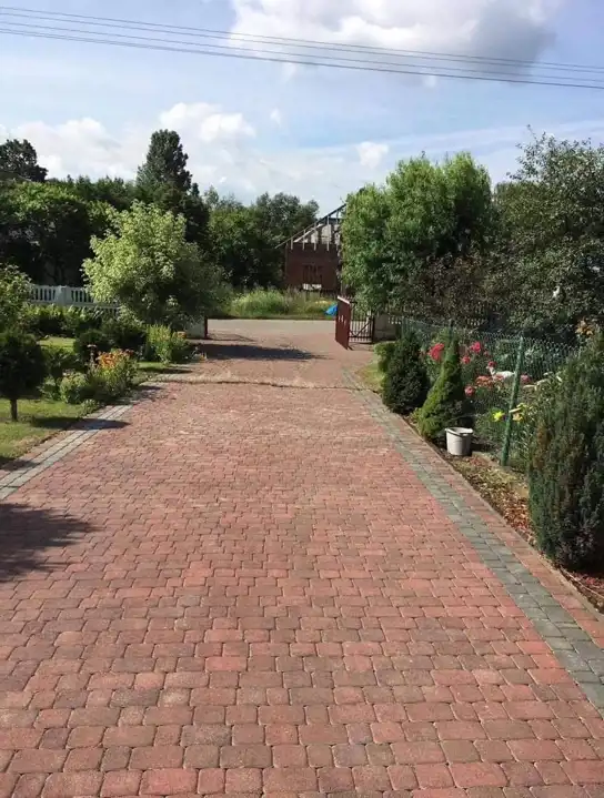 Podwórko jest porośnięte trawą, a od ulicy (wjazd) jest wyłożone kostką.