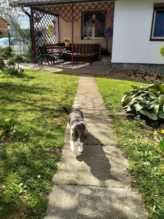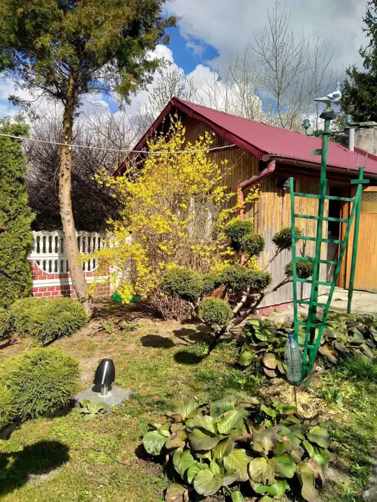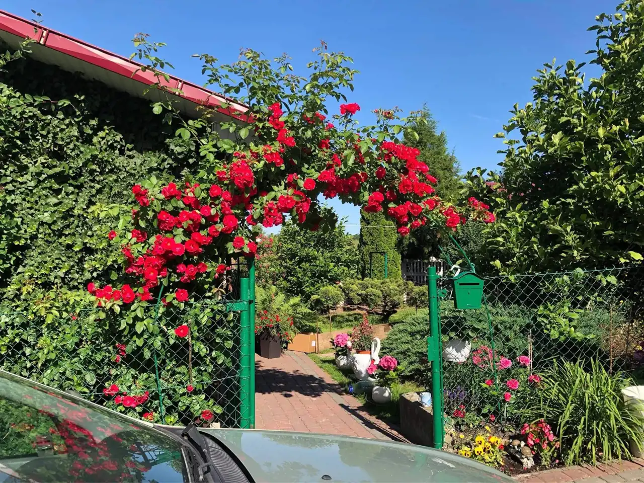 Przed domem jest wypielęgnowany ogródek, otoczenie jest zadbane i uporządkowane.