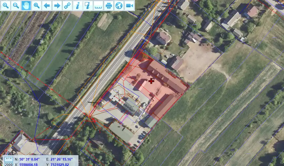 The property is situated directly along National Road No. 79 (Sandomierz – Kraków) and is surrounded by commercial, mixed-use, and undeveloped land.