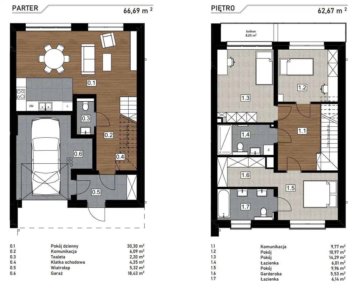 Domy charakteryzują się przemyślanym układem i przestronnymi pomieszczeniami.