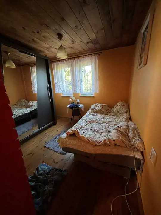 Działka o powierzchni 338m na której usytuowany jest dom o powierzchni 30m.Dół domu to kuchnia, pomieszczenie gospodarcze, natomiast góra to salon, sypialnia i łazienka.Dom ogrzewany kominkiem typu koza góra i dół.
