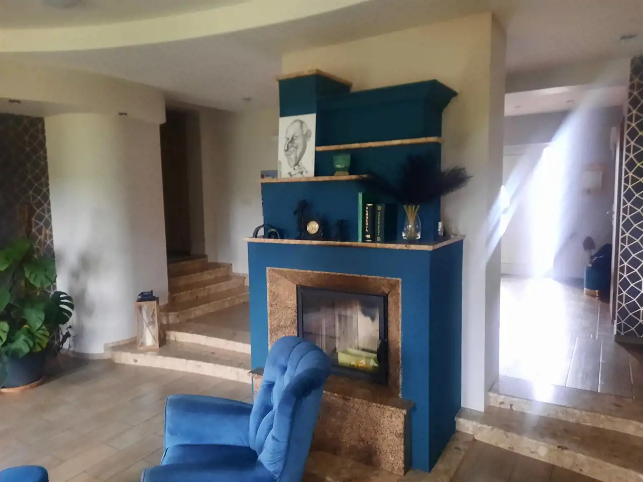 W części mieszkalnej znajduje się duży ok 45 m salon, jadalnia , kuchnia ze spiżarnia oraz wyjście na taras i do ogrodu . W salonie duże, przeszklone okna , wygodna sofa, tv oraz działający kominek .