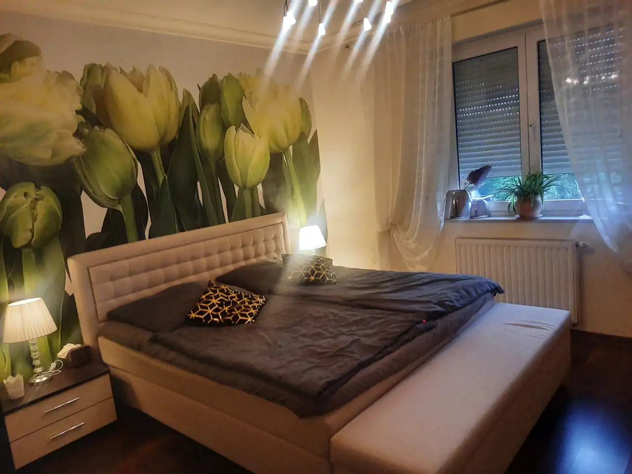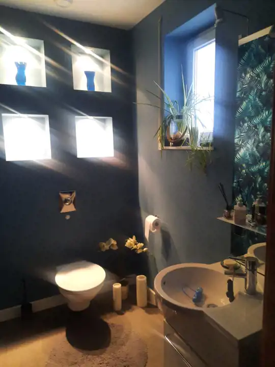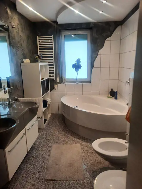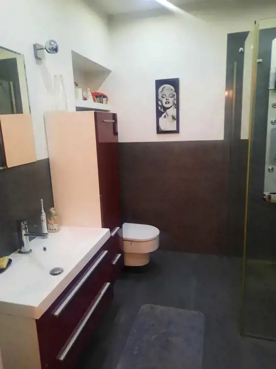 W części sypialnej znajdują się 3 pokoje . Jeden z nich jest połączony z dużą łazienka z wanną ( bidet, wc)oraz garderobą. Kolejne dwa maja wspólną łazienkę z prysznicem i wc.