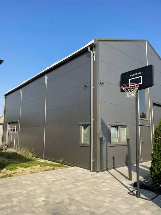 Na działce obok domu znajduje się przestronna hala o wymiarach 14 m x 10 m, co daje łącznie 140 m² powierzchni użytkowej. Budynek ma wysokość 6 m i został wykonany z płyty obornickiej, co zapewnia trwałość i dobrą izolację.