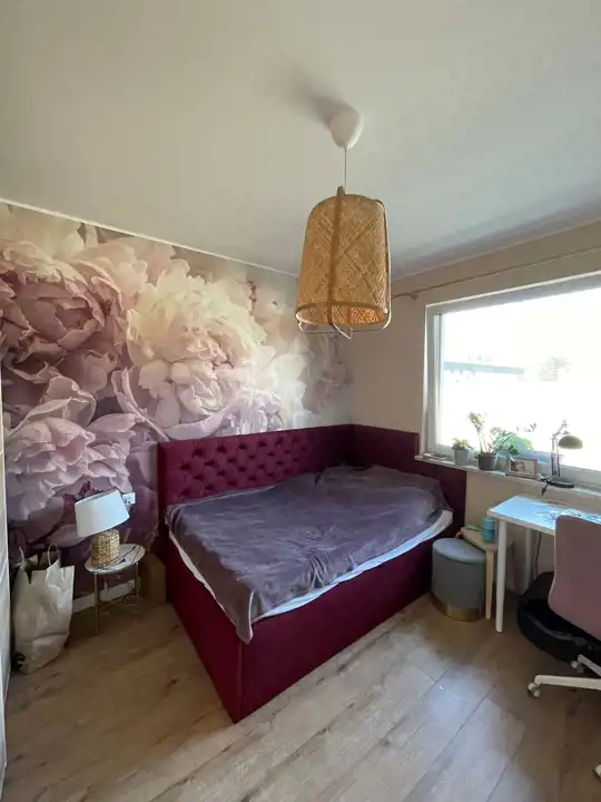 Dodatkowo do dyspozycji jest duża garderoba, która może pełnić również funkcję pomieszczenia gospodarczego. Na podłogach położone są panele, a ogrzewanie podłogowe gwarantuje ciepło i komfort przez cały rok.