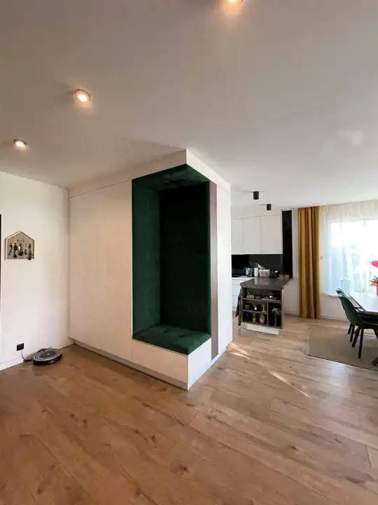 Kuchnia wykonana została na wymiar, w nowoczesnej zabudowie, wyposażona w wysokiej jakości sprzęt AGD. Salon o powierzchni około 35 m², z wyjściem na ogród, zapewnia dużo naturalnego światła.