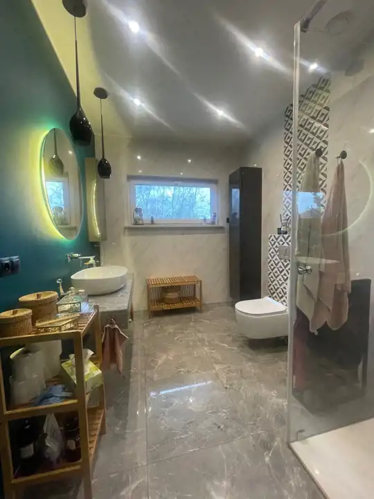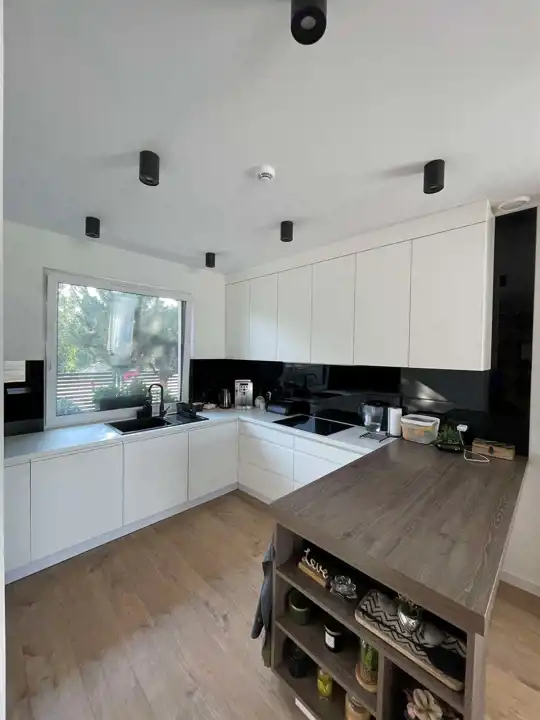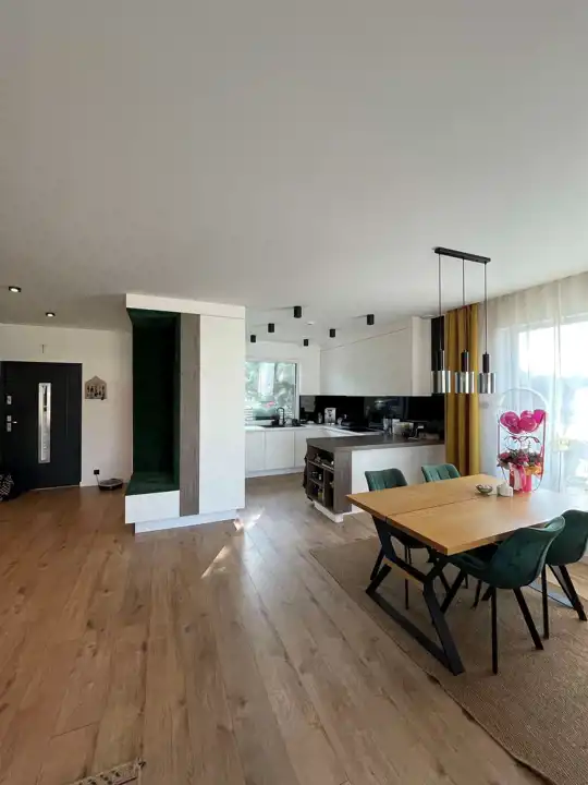 Cała powierzchnia dzienna ma około 50 m², funkcjonalna wyspą kuchenną i z miejscem na stół co tworzy dużą i wygodną przestrzeń do wypoczynku i spotkań z rodziną.