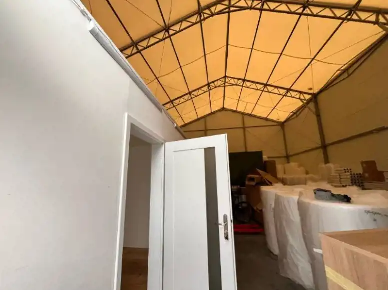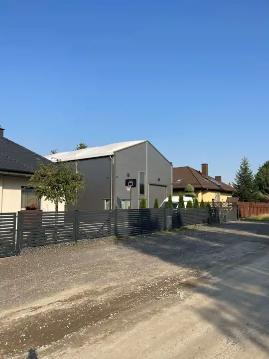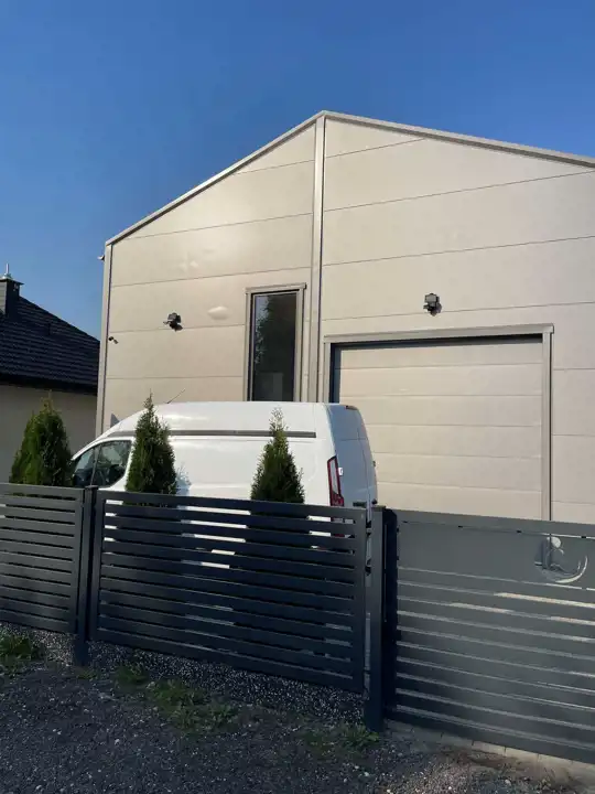 Hala 2021r posiada dwie bramy wjazdowe, co ułatwia manewrowanie i dostęp do wnętrza. Cała posesja jest ogrodzona, a wjazd zabezpieczają dwie solidne, metalowe bramy przesuwne. Wewnątrz hali znajduje się również biuro o powierzchni około 14 m², które może służyć jako przestrzeń do pracy lub magazyn. Posadzki żywiczne.
