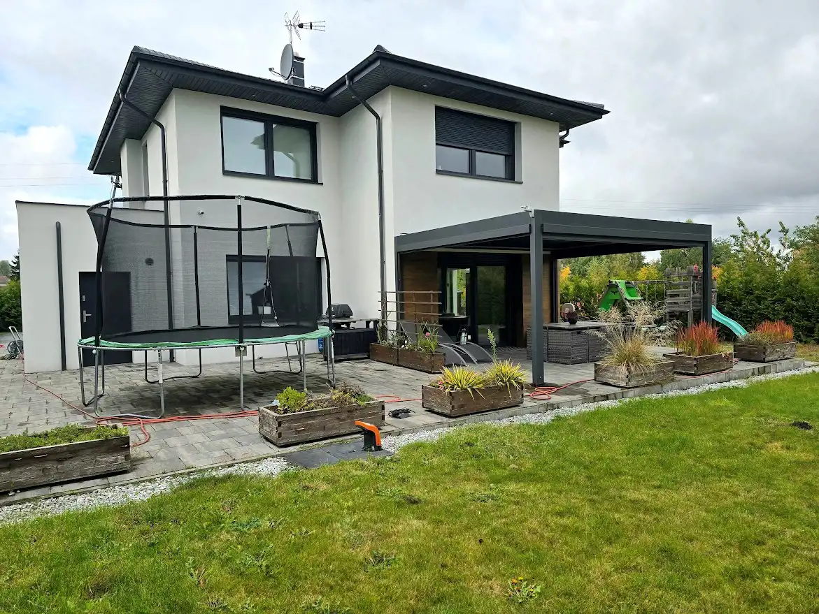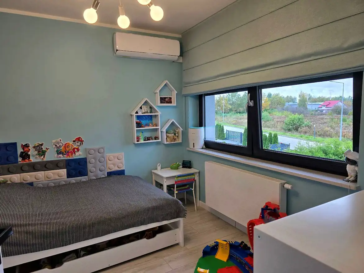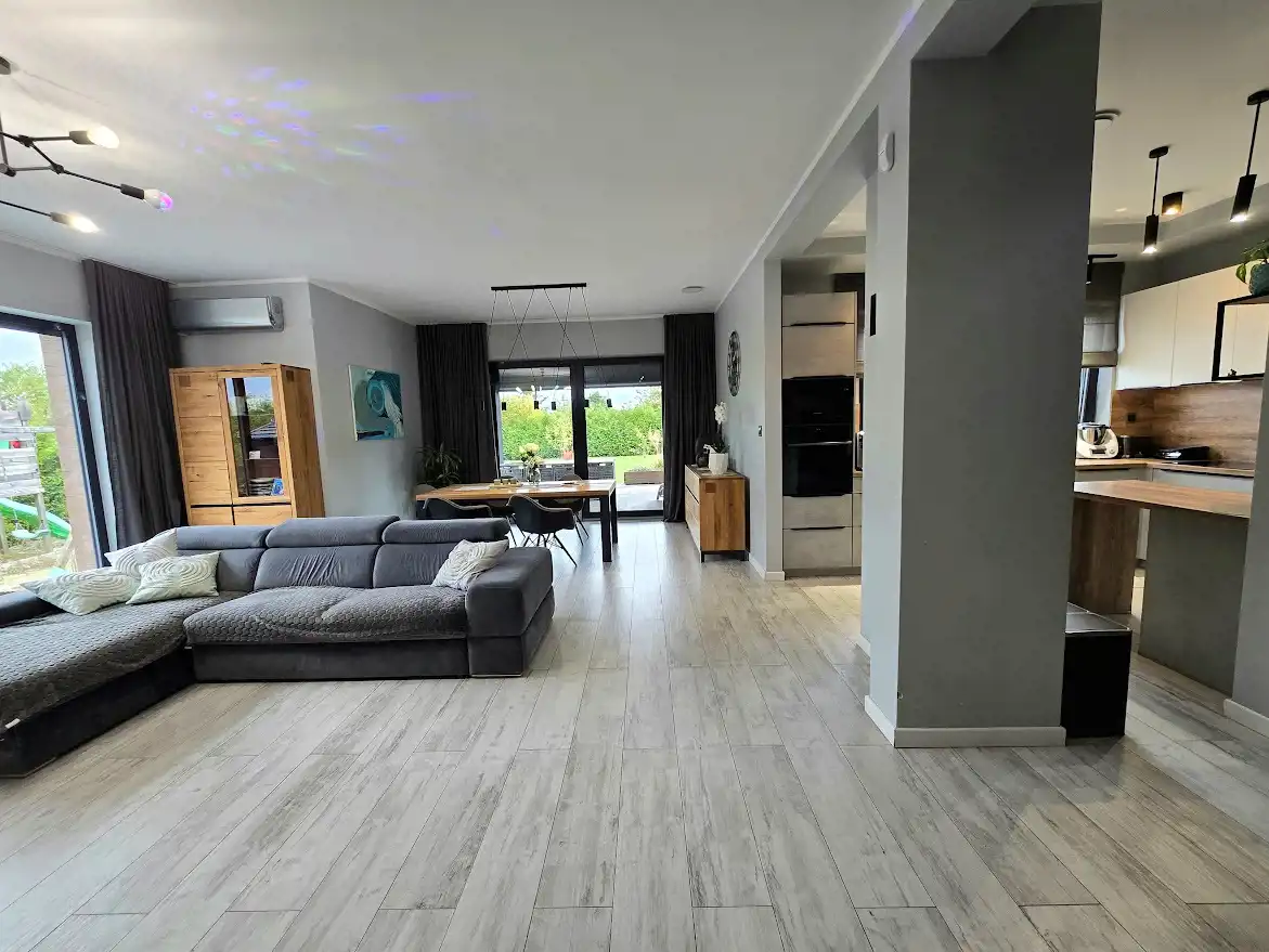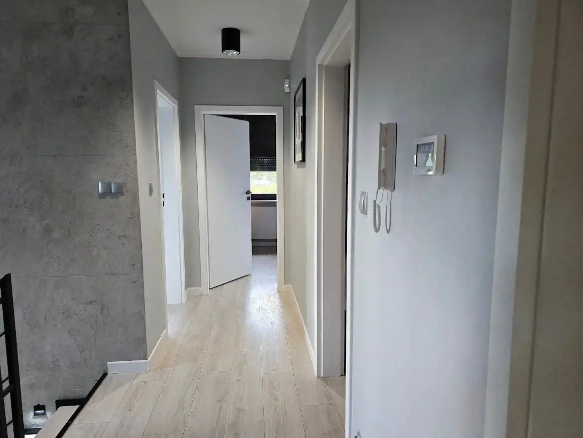 Do dyspozycji domowników jest ponad 70 metrowa strefa dzienna na parterze z wyjściem na ogromny taras,oraz prawie 87 m2 na piętrze ,na którym znajdują się 4 sypialnie,2 łazienki oraz garderoba.