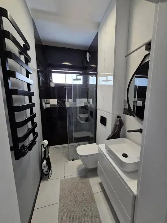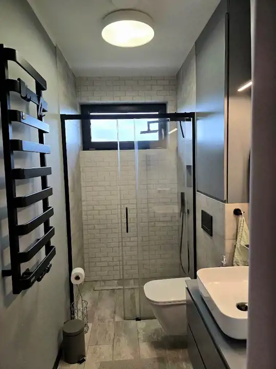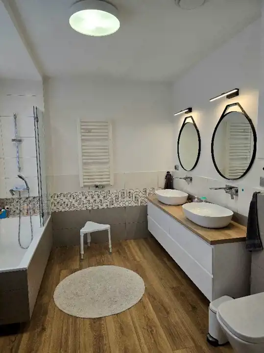•Łazienka z wanna dla miłośników długich kąpieli o powierzchni około 9 m2 z miejscem na pralkę oraz suszarkę