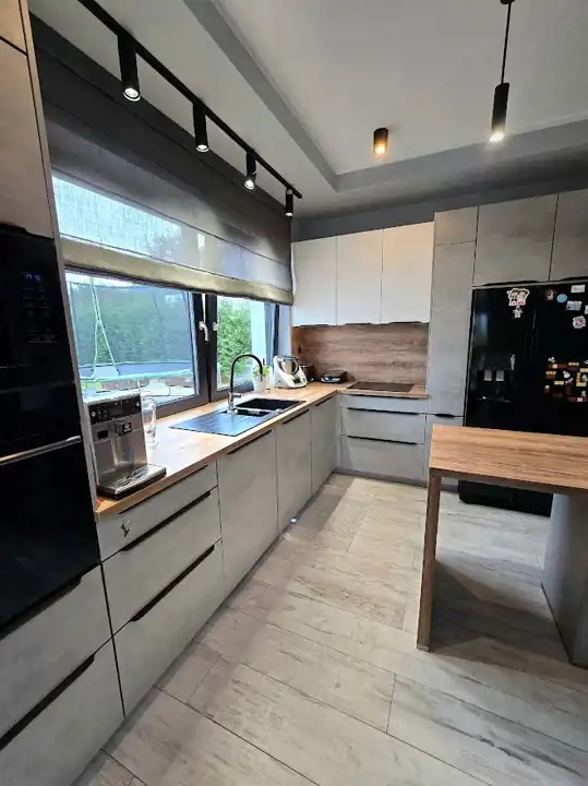 Kuchnia(ok.9m2)jest na wpół zamknięta, z dogodnym dojściem z 2 stron .Dobrze doświetlona z nowoczesna zabudowa kuchenna wraz z nowoczesnym sprzętem AGD.