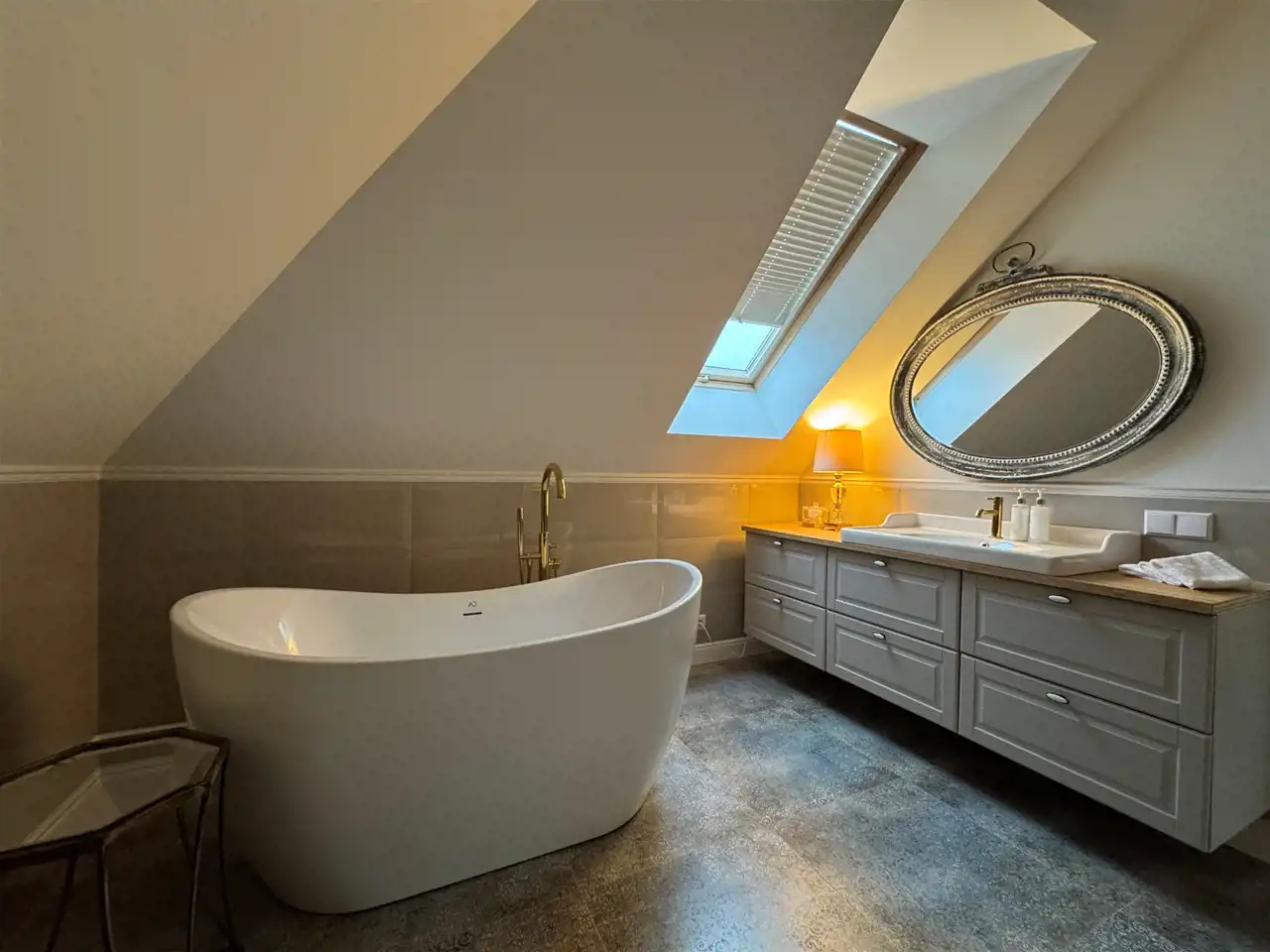 Parter to imponujący salon z jadalnią, kominkiem, wyjściem do oranżerii, wygodna kuchnia ze sprzętem AGD najwyższej jakości, łazienka dla gości, garderoba, spiżarnia, kotłownia oraz przejście do garażu.