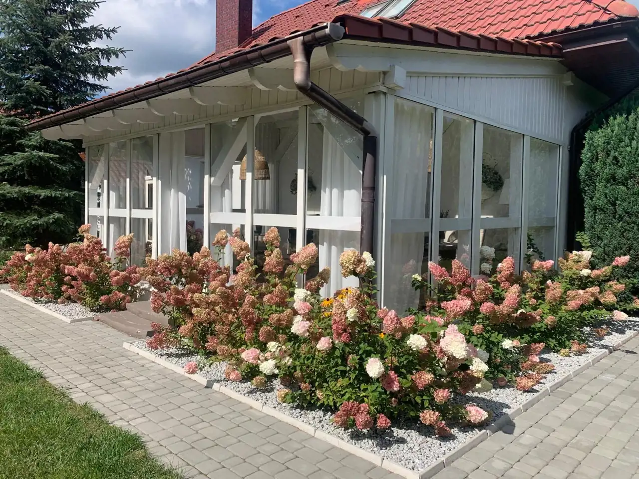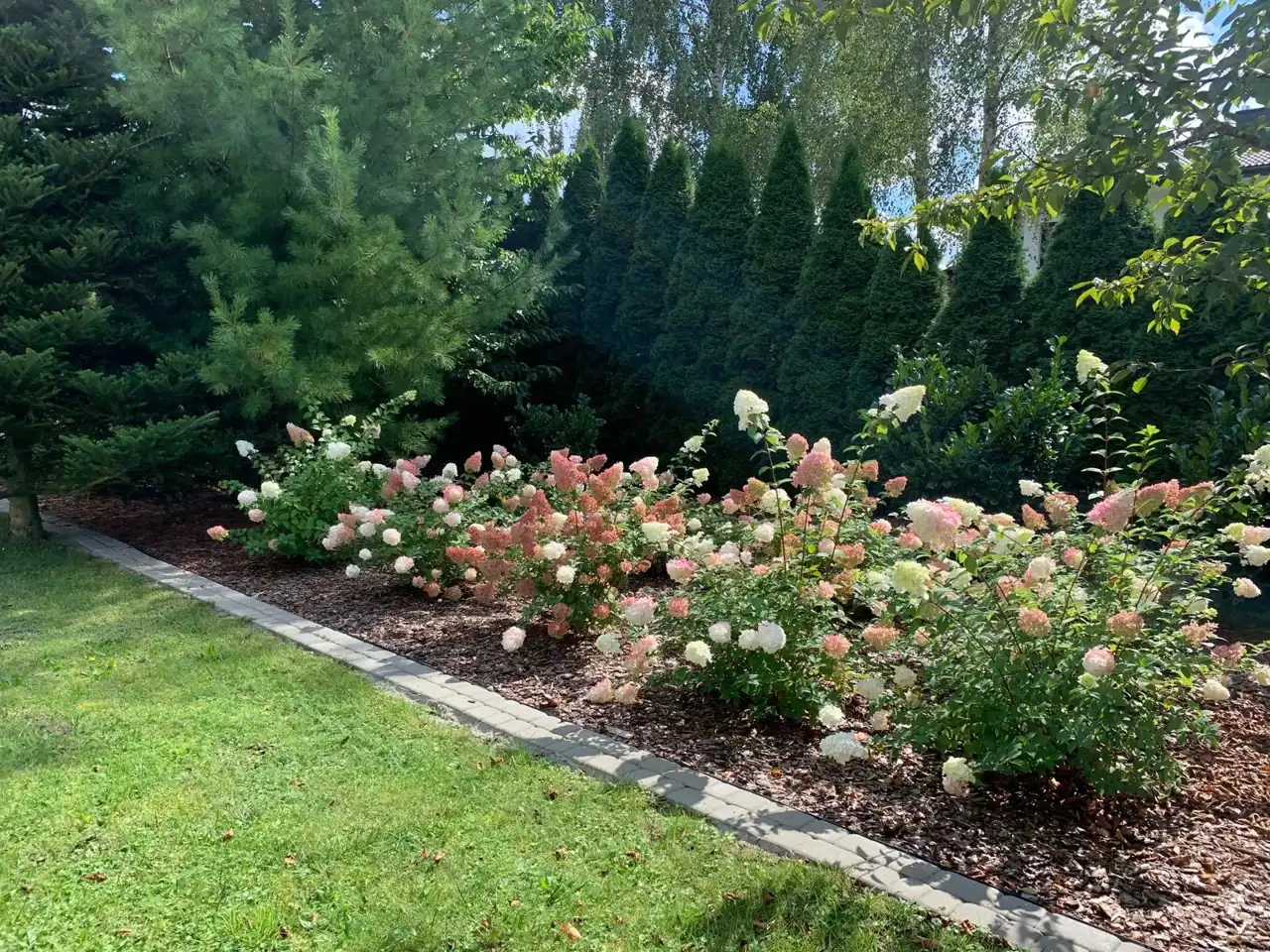 Działka o powierzchni 1073 m² została starannie rozplanowana – zadbany trawnik, hortensje, automatyczne podlewanie oraz domek gospodarczy stanowią idealną, spójną całość.