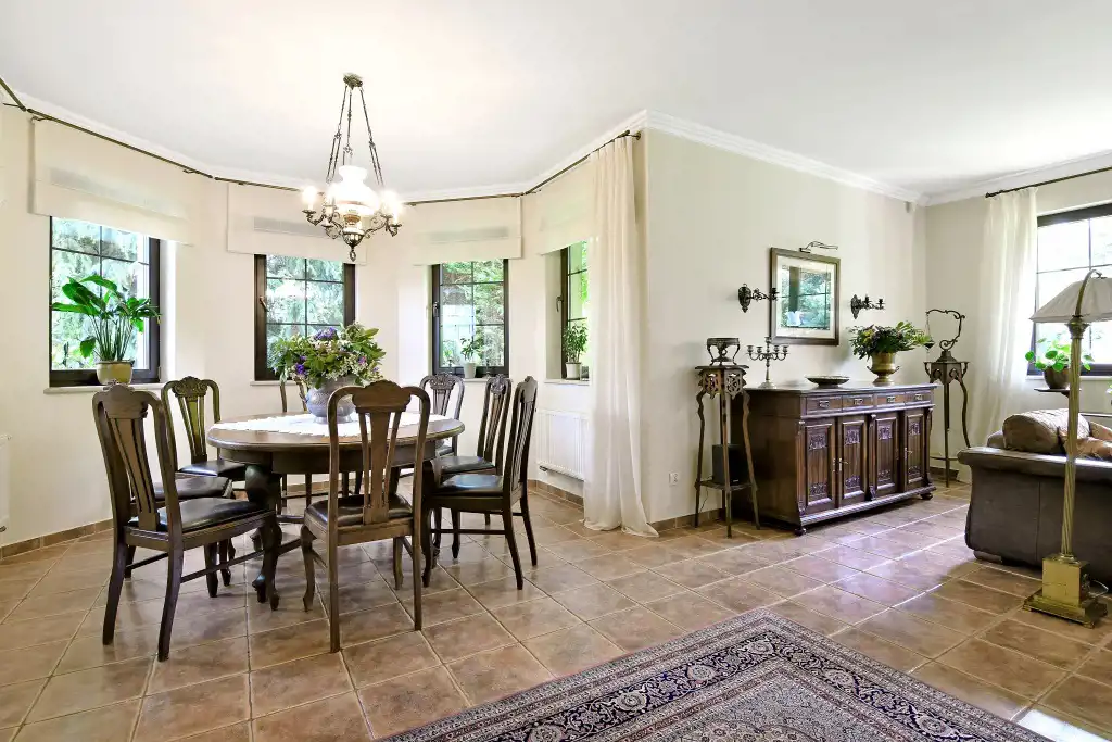 Na parterze znajduje się przestronny salon z panoramicznymi oknami, które zapewniają zapierający dech w piersiach widok na zadbany ogród. Bezpośredni dostęp do tarasu stwarza doskonałe warunki do relaksu i organizowania letnich spotkań. Część jadalna, wkomponowana w salon, sprzyja wspólnym posiłkom, a stylowa, włoska kuchnia to prawdziwa perła dla miłośników gotowania. Obok znajduje się elegancka łazienka dla gości oraz funkcjonalny gabinet, idealny do pracy zdalnej lub prowadzenia działalności.