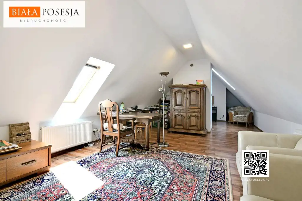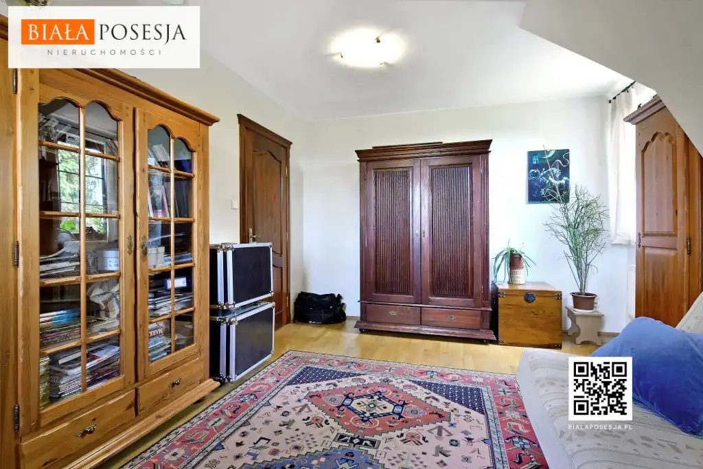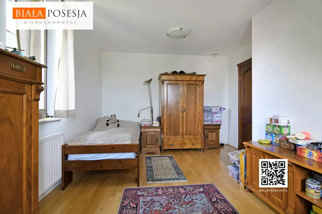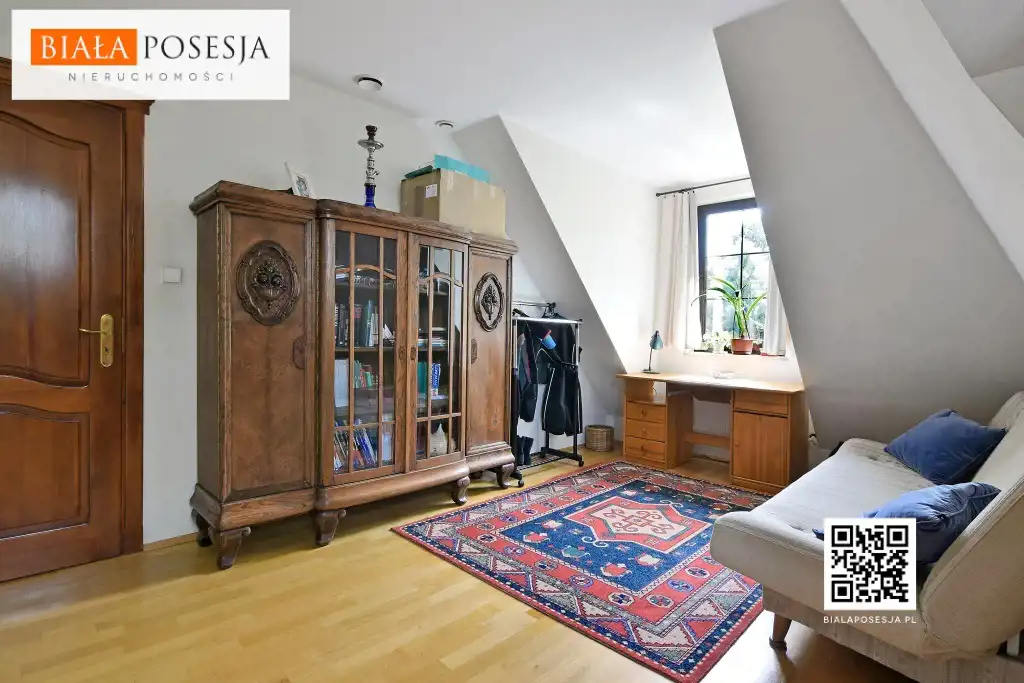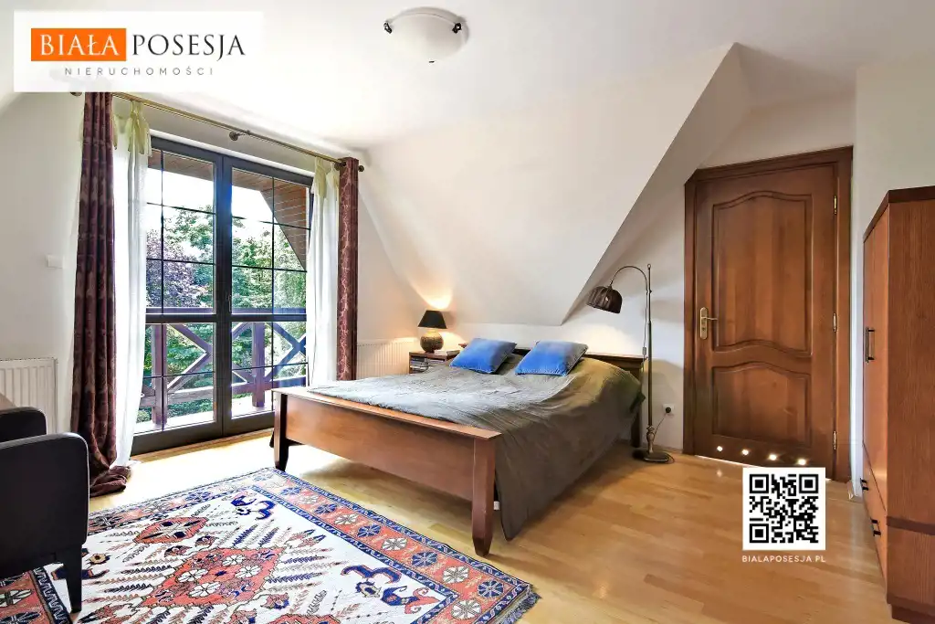 Na piętrze czekają cztery wygodne pokoje, w tym główna sypialnia o powierzchni 25 m², z prywatną garderobą, łazienką oraz balkonem z widokiem na zieleń. Przestronny pokój kąpielowy i wbudowane garderoby na korytarzu to kolejne atuty, które zapewniają codzienny komfort.