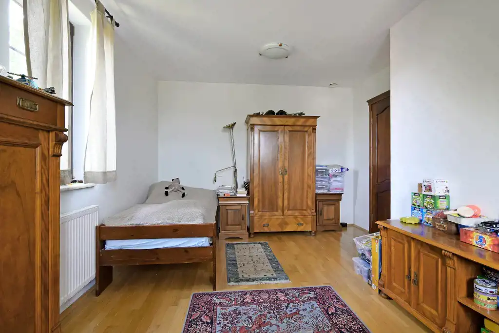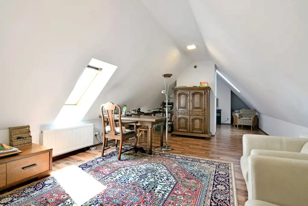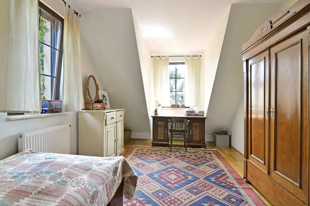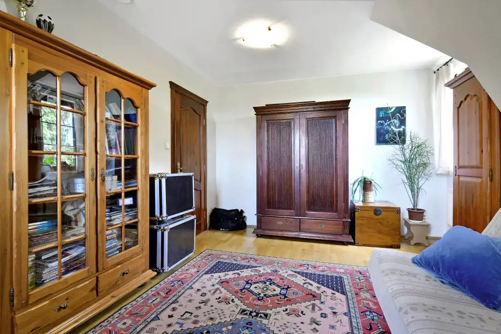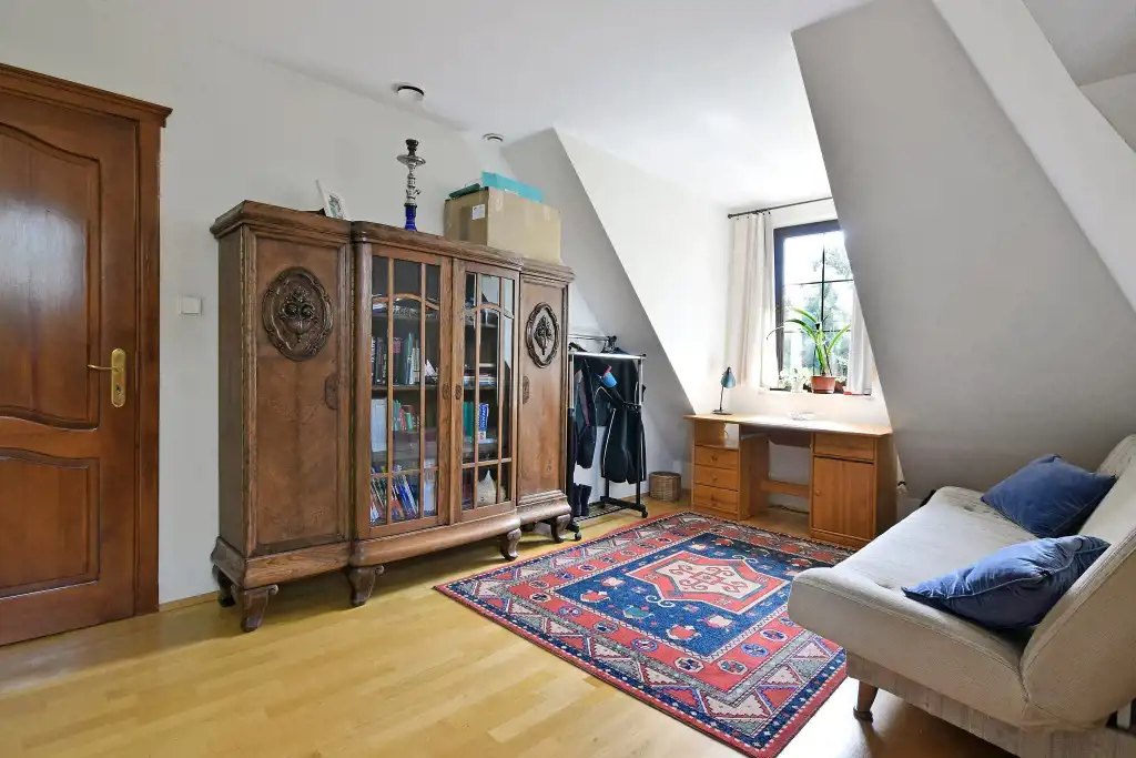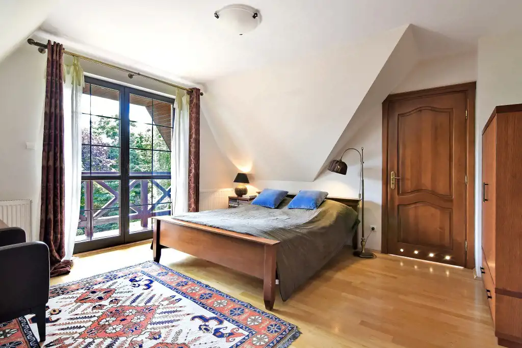 Na piętrze czekają cztery wygodne pokoje, w tym główna sypialnia o powierzchni 25 m², z prywatną garderobą, łazienką oraz balkonem z widokiem na zieleń. Przestronny pokój kąpielowy i wbudowane garderoby na korytarzu to kolejne atuty, które zapewniają codzienny komfort.