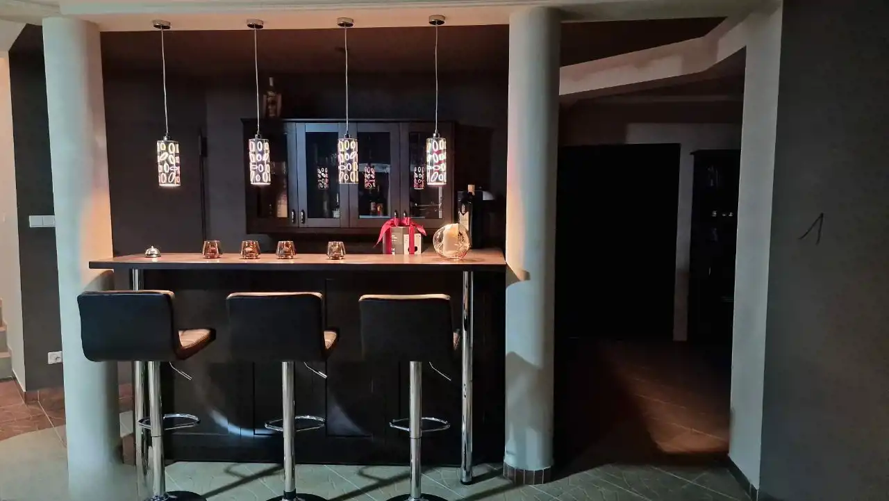 Podpiwniczenie o powierzchni 118 m² zostało zaaranżowane jako prywatna przestrzeń wypoczynkowa – z kinem domowym, barem oraz częścią klubową. To idealne miejsce na wieczorne spotkania i odpoczynek w gronie najbliższych.